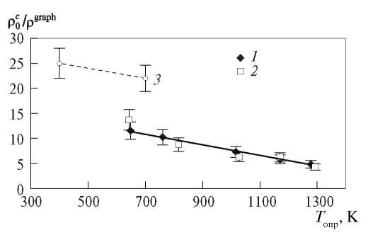 Рис. 1. Зависимости удельного КЭС, измеренного в ПК при Р = 100 кПа и отнесенного к удельному электрическому сопротивлению графита для аналогичного образца без ПК, от определяющей температуры: 1 – источник питания находится около верхнего торца образца; 2 – нижнего торца образца; 3 – результаты [8].