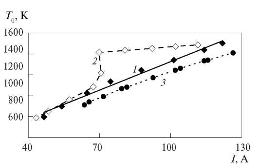 Рис. 4. Зависимости температуры, измеренной в ПК, от силы тока I в режиме нагрева (1) и охлаждения (2) с источником питания около верхнего торца образца при Р = 100 кПа; 3 – температура в центре изотермического участка для образца, в котором отсутствует ПК.