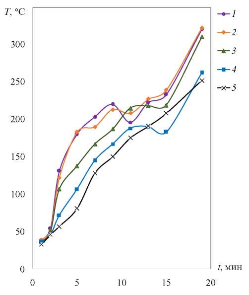 Рис. 3. Изменение температуры во времени в фиксированных точках образца при СВЧ-нагреве: 1 – 2 см, 2 – 4, 3 – 6, 4 – 8, 5 – 10.