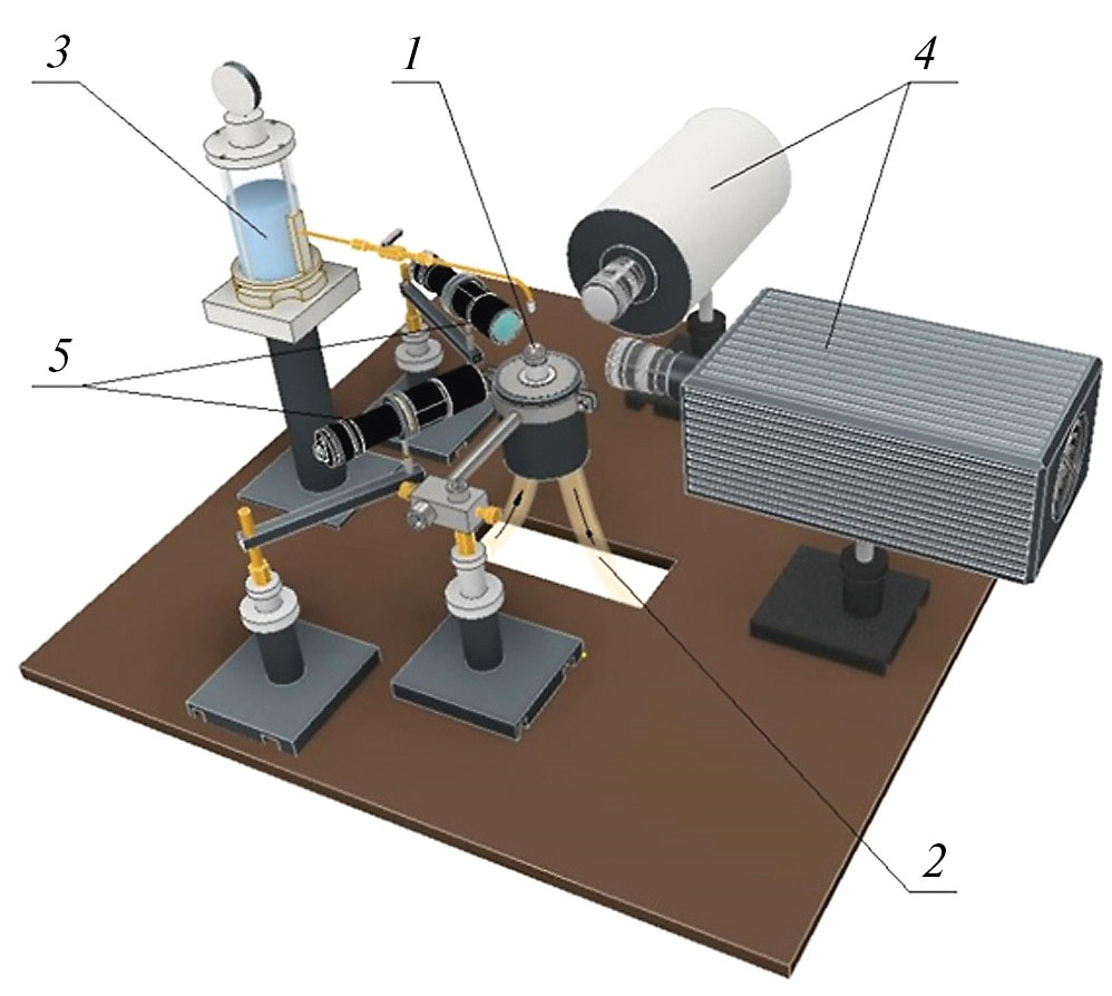 Рис. 1. Схема экспериментальной установки: 1 – модель, 2 – контур охлаждения рабочего участка, 3 – генератор капель, 4 – скоростные видеокамеры, 5 – фонари подсветки.