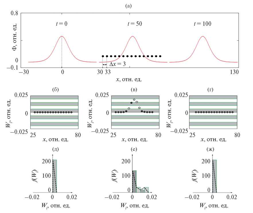 Сначала рассмотрим принцип расчета функции распределения по энергиям на примере малого ансамбля ионов, содержащего N ионов фоновой плазмы. Из рис. 2а видно, что ионы равномерно расположены на прямой линии вдоль оси x с межчастичным расстоянием ∆x (ситуация наглядно представлена на рис. 2 в работе [36]). Будем считать, что в начальный момент времени солитон находится слева от ансамбля ионов, при этом он не возмущает их состояние. Положим, что волна движется слева направо. Через некоторое время солитон достигнет ионов ансамбля и начинает влиять на их динамику. Представляет интерес функция fN(Wi) именно в этот момент. Движение однозарядных ионов в лабораторной системе координат найдем из второго закона Ньютона в нормированном виде [32, 36]: