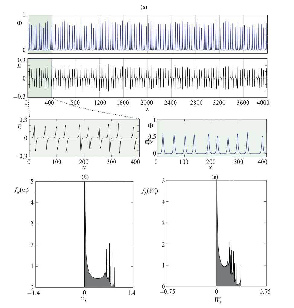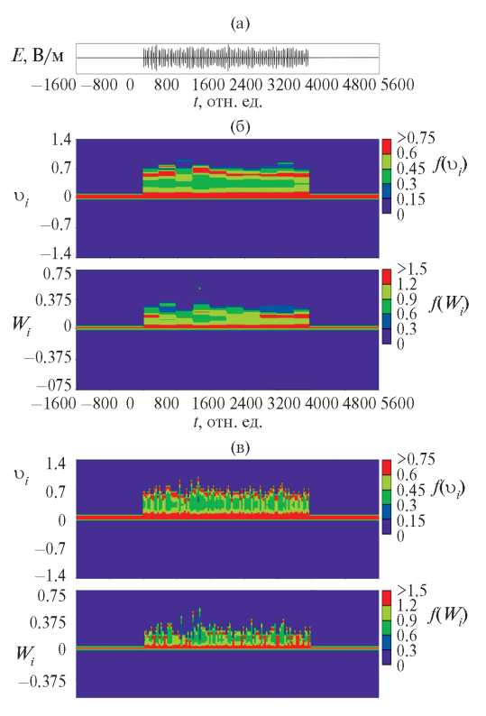 Рис. 6. Моделирование группы из 100 солитонов: (a) – профили электрического поля; (б), (в) – функции распределения по скоростям и энергиям fN(υi), fN(Wi), рассчитанные для случаев низкого и высокого временного разрешения соответственно.