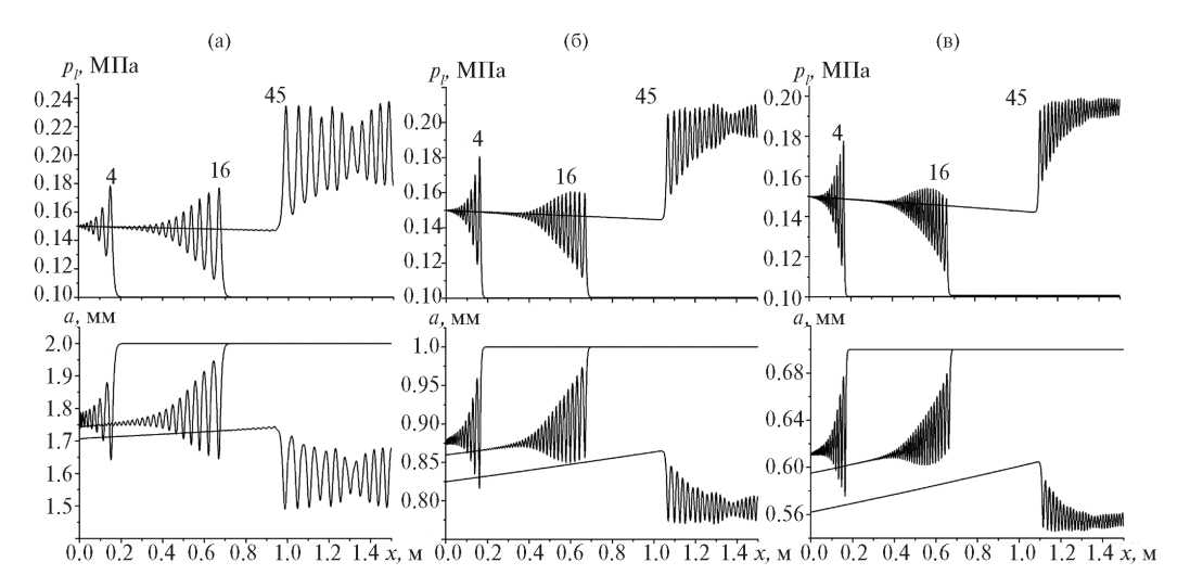 Рис. 7. Эпюры волн давления (верхний ряд), радиуса пузырька (средний ряд) и объемного газосодержания (нижний ряд) в коническом канале: (а) – без учета дробления пузырьков и при отсутствии в системе ПАВ, (б) – с учетом дробления пузырьков только из-за сужения канала, (в) – при дроблении пузырьков и добавлении в среду ПАВ; числа у кривых – моменты времени в мс.