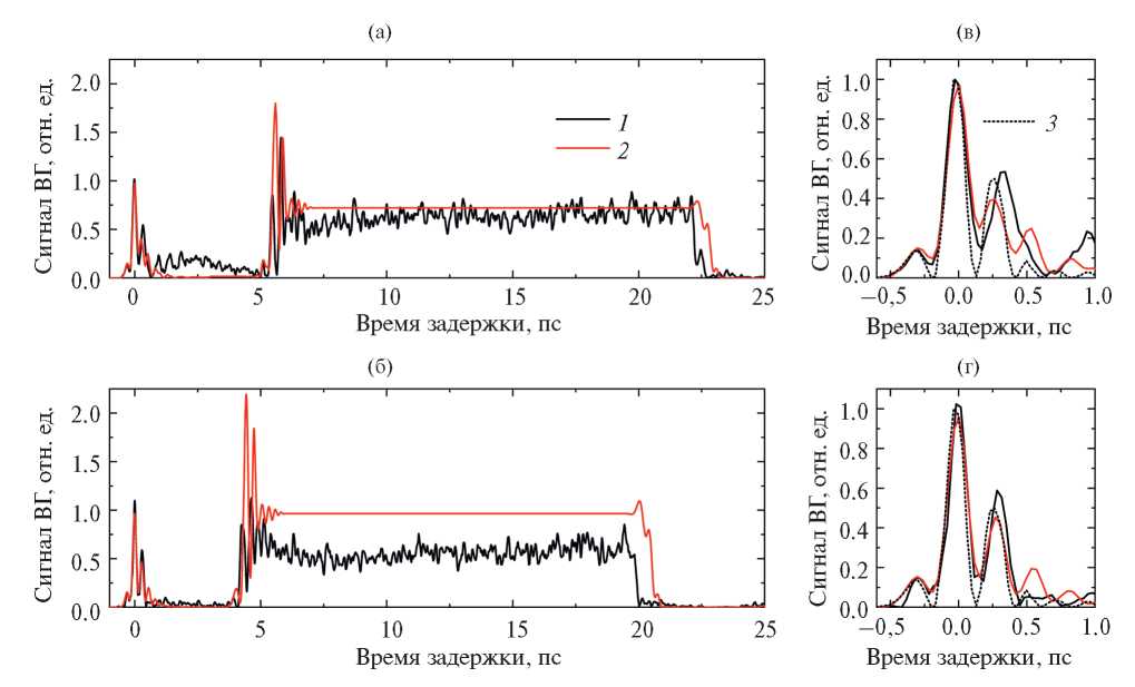При L = 1 мм для необыкновенной и обыкновенной волн накачки получаем = 5.62 и 4.16 пс соответственно в точном согласии со значениями времени задержки подъема кривых на графиках рис. 3а, 3б. Резкое возрастание сигнала ВГ объясняется излучением «вынужденной» волны из-за нарушения адиабатического режима на выходной границе сапфира. Заметная модуляция сигнала ВГ связана с высвечиванием хвоста ТГц-импульса через выходную грань, а также интерференцией падающего и отраженного ТГц-импульсов (коэффициент отражения по полю в ТГц-диапазоне составляет около 50%).