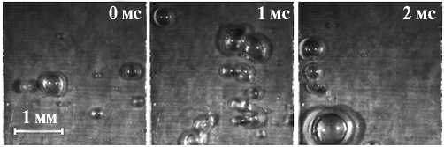 При экспериментах с водой при атмосферном давлении в широком диапазоне недогревов (∆tнед = 30–75оС) было зафиксировано хаотическое пространственное распределение пузырей на греющей поверхности во времени, т.е. отсутствие постоянно действующих центров паро-образования, характерных для кипения жидкости при температуре насыщения (процесс иллюстрируется на видео № 11 с частотой съемки 50 кГц, кадры – на рис. 1) [17]. Скорее всего, это объясняется тем, что при быстром схлопывании (за 300–500 мкс от максимального размера) парового пузыря в недогретой жидкости во впадине, которая являлась центром парообразования, не остается пузырька малого размера, как при кипении жидкости при температуре насыщения. Таким образом, происходит деактивация центра парообразования. И процесс начинается заново на новом центре.