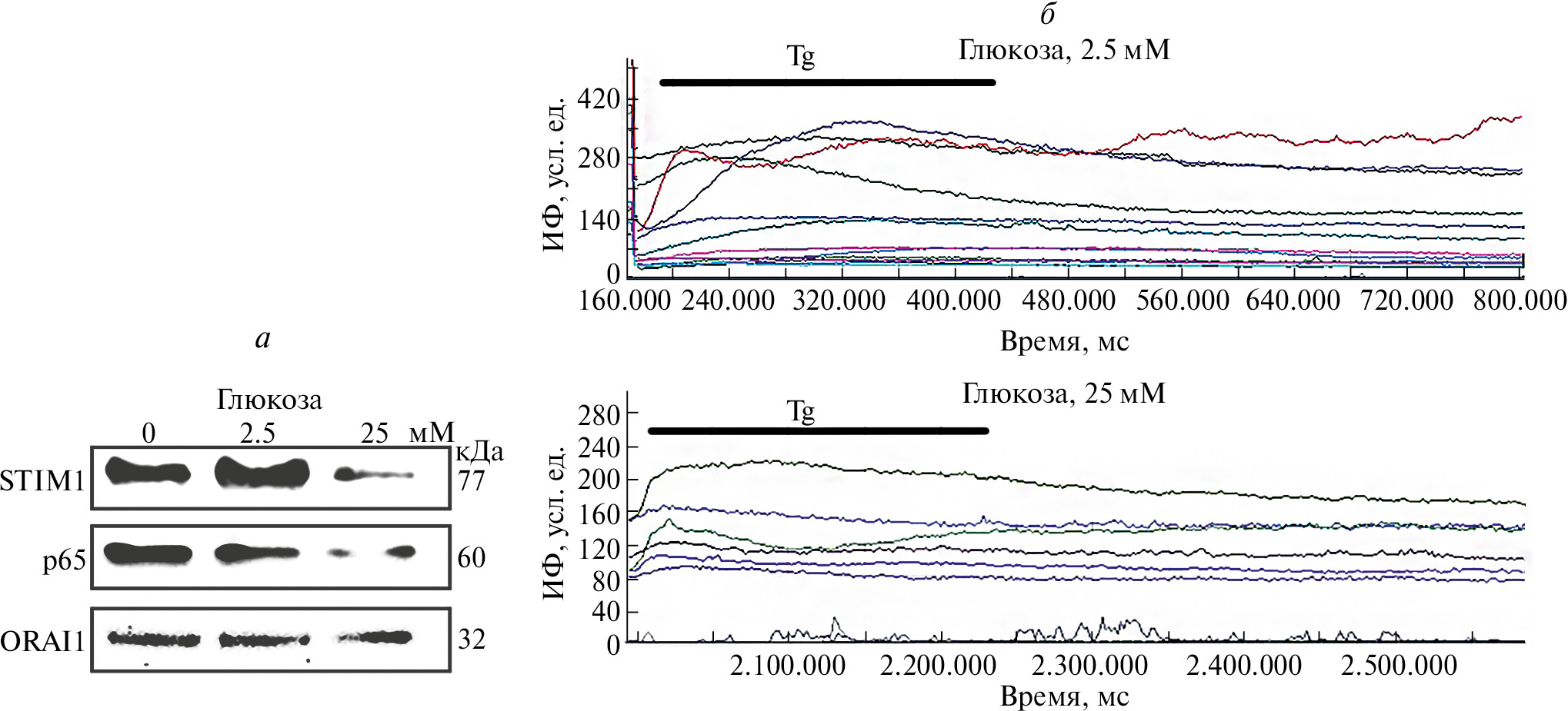 Рис. 7. Влияние глюкозы на депо-зависимый вход кальция в клетки Сасо-2: а – Вестерн-блотинг: влияние различных концентраций глюкозы на содержание белков STIM1, ORAI1 и субъединицы p65 фактора NF-kB в клетках Сасо-2; б – более низкий депо-зависимый вход кальция (в ответ на действие тапсигаргина Tg) в клетки Сасо-2 после нагрузки их 25 мМ глюкозы (по сравнению с таковым после нагрузки клеток 2.5 мМ глюкозы). Показана зависимость интенсивности флуоресценции (ИФ) кальций-чувствительного зонда Fluo-4 (ось OY) от времени (ось OX) по данным прижизненной конфокальной микроскопии. Цветные линии на графиках показывают сигнал от разных клеток, находящихся в одном поле зрения.