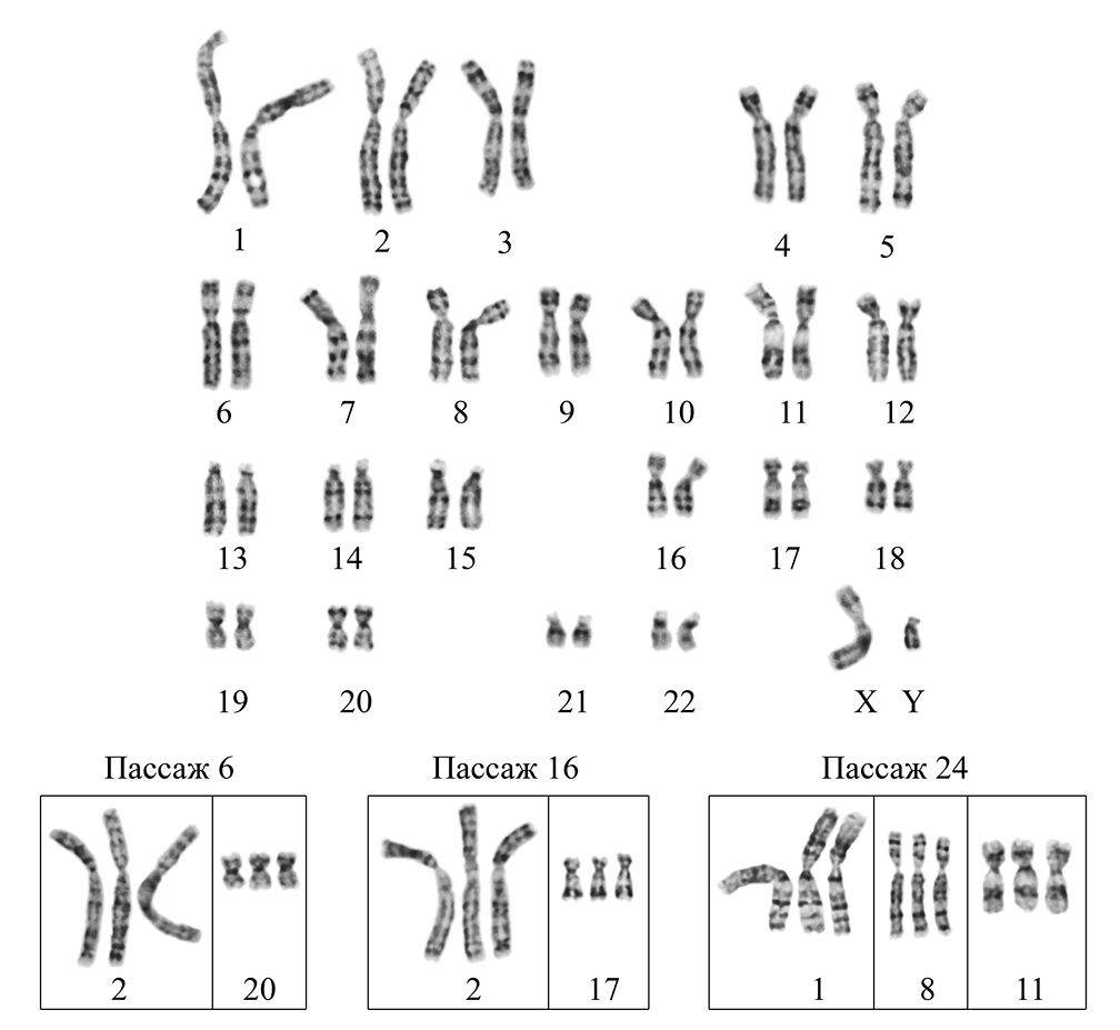 Для структурного кариотипического анализа проводили дифференциальное G-окрашивание хромосом в соответствии с ранее описанной методикой (Ozkinay, Mitelman, 1979). Анализировали 100 метафаз. Клетки исследуемой линии анализировали на пассажах 6, 16, и 24. Кариотипы анализировали с помощью микроскопа Axio Imager.M1 (Carl Zeiss, ФРГ) с системой автоматического кариотипирования Ikaros 4 Karyotyping System (MetaSystems, Германия) и описывали в соответствии с Международной номенклатурой хромосом человека ISCN (McGowan-Jordan et al., 2016).