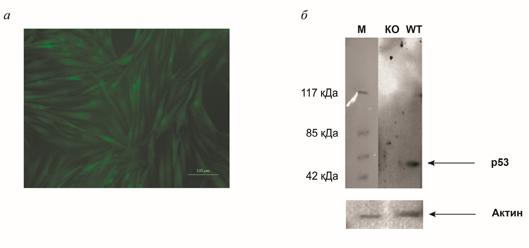 Рис. 3. Детекция нокаута p53 в фибробластах. а – Фибробласты пациента с дисферлинопатией, трансдуцированные лентивирусом LVUHshp53-gfp.3. б – Вестерн-блот: КО – иммортализованные фибробласты кожи пациента с дисферлинопатией, полученные путем нокаута гена-онкосупрессора p53 (53 кДа), WT – фибробласты кожи пациента с дисферлинопатией. М – мол. маркер.