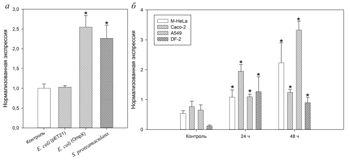 Мы проанализировали эффект заражения бактериями S. proteamaculans (после 24- и 48-часового роста) на экспрессию генов рецептора ЭФР и β1-интегрина клеток тех же линий. Оказалось, что заражение бактериями вызывает увеличение экспрессии β1-интегрина во всех использованных клеточных линиях. При этом его экспрессия в клетках Caco-2 и DF-2 сильнее увеличивается в ответ на заражение бактериями на ранней стационарной стадии роста, а в клетках А549 – в ответ на заражение бактериями на поздней стадии роста; клетки M-HeLa одинаково отвечают на заражение бактериями этих двух стадий роста (рис. 2а). Экспрессия гена рецептора ЭФР имеет схожую тенденцию к увеличению (рис. 2б). Кроме того, мы обнаружили, что в клетках линии Caco-2 экспрессия гена рецептора ЭФР в ответ на заражение бактериями на поздней стационарной стадии роста практически не увеличивается.