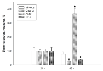 Рис. 3. Интенсивность инвазии бактерий S. proteamaculans в клетки эукариот. Бактерии на стадии роста 24 и 48 ч добавляли к клеткам эукариот на 2 ч. Интенсивность инвазии 24-часовых бактерий принимали за 100%. Различие интенсивности инвазии бактерий разных стадий роста считали достоверным при *P < 0.05.