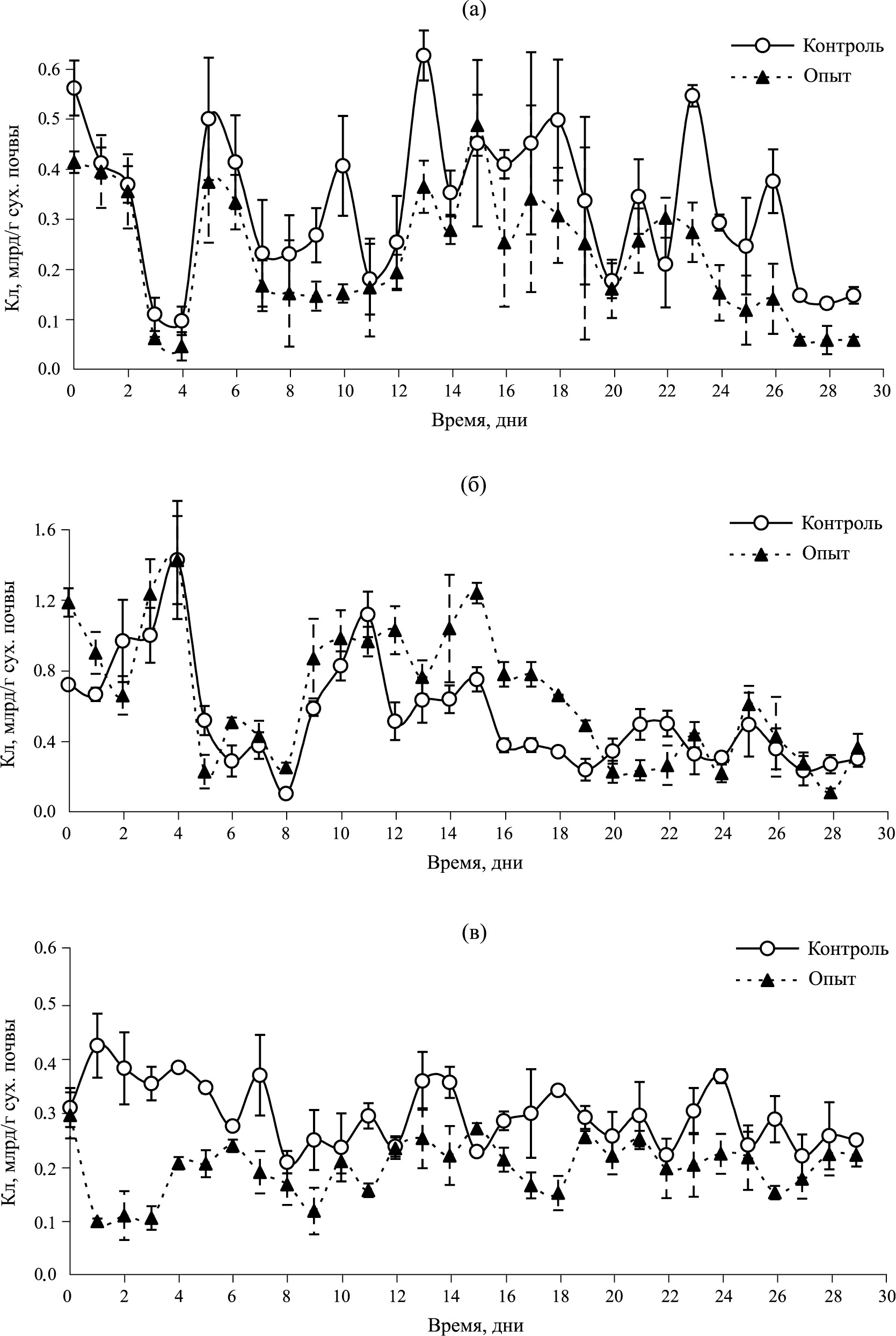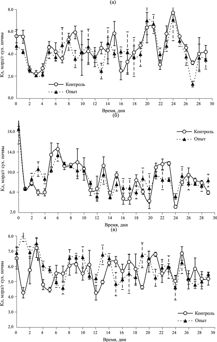 Рис. 1. Учет общего количества клеток бактерий в почве с использованием красителя FITC в опытном и контрольном вариантах в трех экспериментах (а), (б) и (в) соответственно. Величины, обозначенные на рисунках 1–3 точками, представлены средними арифметическими, величины отклонений на графиках представлены как результаты, рассчитанные в стандартной программе Excel.