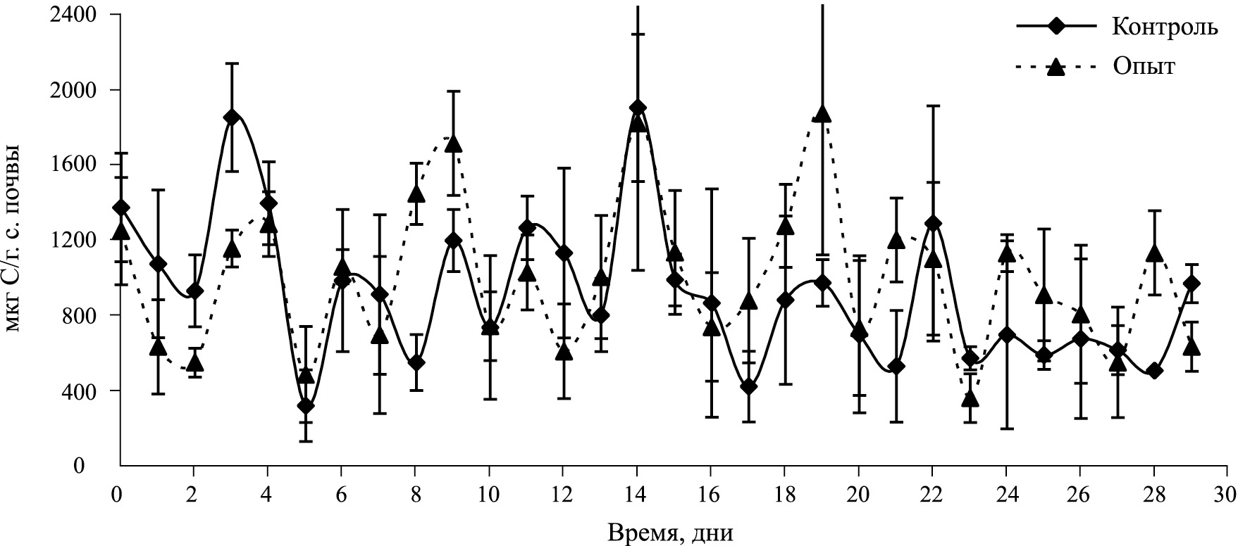 Рис. 3. Динамика РОВ в почве в контроле и опыте в 3-м эксперименте.