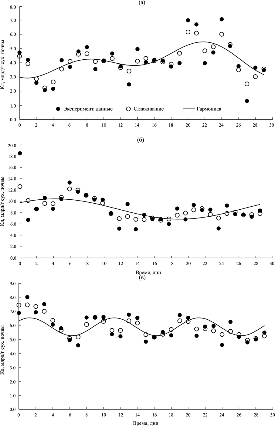 Гармоническим анализом результатов численности живых бактерий в контрольном образце третьего эксперимента (рис. 7в; табл. 1) обнаружено две гармоники 2-го и 3-го порядков с периодами 15 и 10 дней. Амплитуды живых клеток были равны 0.29 и 0.38 млрд, при этом амплитуды гармоник общего количества клеток составляли 2.44 и 3.37 млрд, то есть почти на порядок больше, что также наблюдалось в первом эксперименте. Гармоническим анализом результатов учета живых клеток в опытном образце почвы третьего эксперимента выявлены две гармоники 1-го и 4-го порядков с периодами 30.0 и 7.5 дней (рис. 7в; табл. 1), с амплитудами 0.25 и 0.32 млрд. Амплитуда гармоники общего количества клеток составляла 6.37 млрд. В этом эксперименте амплитуды гармоник численности живых клеток в 20–25 раз меньше, чем амплитуды гармоник учета общего количества клеток. Таким образом, учет общей численности клеток бактерий выявил значимое превышение их численности — порядок или более над численностью живых бактерий. Гармонический анализ подтвердил закономерность волнообразной динамики изменения численности клеток бактерий в почве как следствие отмирания части микробного сообщества и последующего прироста.