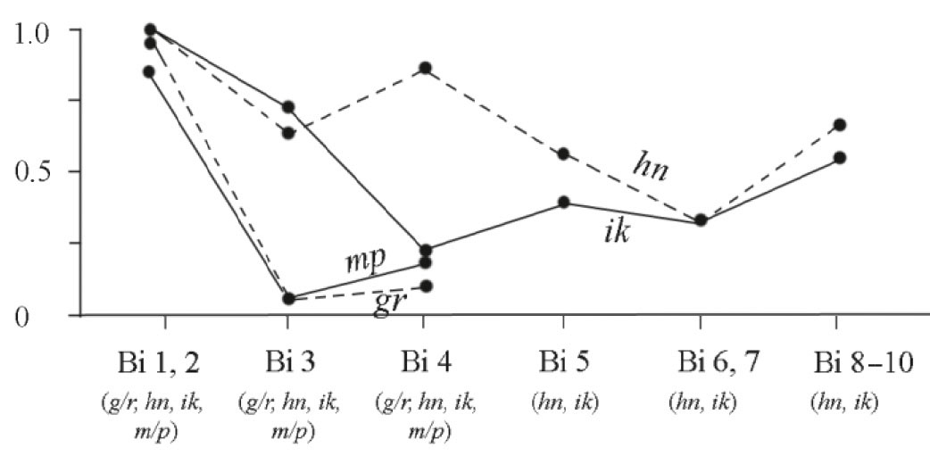 Раса Białowieża описана в бас. р. Висла на территории Польши, но в дальнейшем метацентрики этой расы отмечены на значительной территории в полиморфных популяциях Беларуси на восток до рр. Птичь и Березина (рис. 1, кружки). В популяциях первоначально описанного ареала расы Białowieża (рис. 1, Bi 1, Bi 2) в бас. р. Висла фиксированы соединения hn и ik, а соединения gr и mp встречаются с частотой близкой к 1.0 (Wójcik et al., 1996; Banaszek et al., 2009). Восточнее, в направлении р. Птичь –притока р. Припять – все метацентрики этой расы становятся полиморфными. Популяции с метацентриками расы Białowieża распространены на восток до низовий р. Птичь (рис. 1, Bi 5) и р. Березина севернее г. Бобруйск (рис. 1, Bi 8–10). По мере приближения к р. Птичь особенно быстро снижается частота соединений gr и mp, до 0.1–0.2 (рис. 5, Bi 3, Bi 4) и во многих исследованных популяциях эти метацентрики исчезают. Наиболее стабильной остается частота метацентриков hn и ik (рис. 5). В большинстве популяций с метацентриками расы Białowieża сохраняется акроцентрический кариотип с частотой близкой к 0.2. Отмечается избыток гетерозигот h/n и i/k, по сравнению с ожидаемым при случайном скрещивании (табл. 1, Bi 4–10).