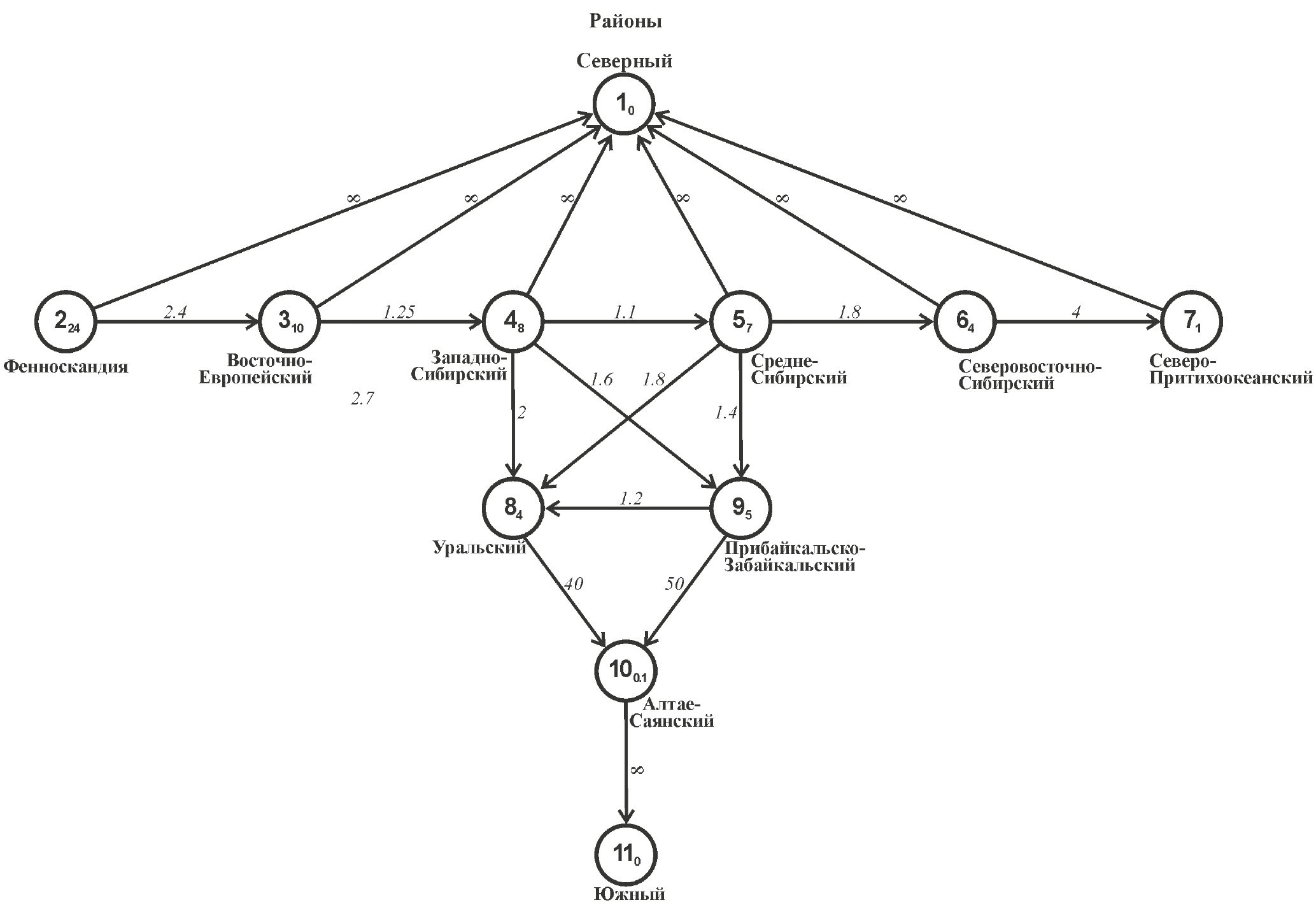 Граф по зимнему обилию свиристеля представлен тринадцатью районами (рис. 5). В первый из них вошли территории полярных пустынь, тундровой и лесотундровой зон. Здесь свиристель зимой не встречен. Выше всего среднее обилие свиристеля в Западной Сибири (32 особи/км2). Далее уменьшение значений так же, как и летом, отмечено во всех направлениях по странам света, а также в горных регионах, особенно в сочетании с их более южным расположением. К западу обилие снижается в 3–4 раза, к востоку, особенно в горных ландшафтах, – в 2–5 раз. К югу в Алтае-Саянской горной стране отмечено трехкратное уменьшение, по сравнению с Западно-Сибирской равниной. В сторону Байкала оно достигает 10 раз. Особенно велико снижение значений по Крыму и Кавказу (в 200 раз) и Средней Азии (8–20 раз). Обобщенный граф включает пять районов (рис. 6). К первому и пятому (Северному и Южному) отнесены территории, где свиристель не встречен. 2–4 районы ориентированы с запада на восток, в них показатели обилия от центра (Западно-Сибирская равнина) убывают к западу и к востоку.