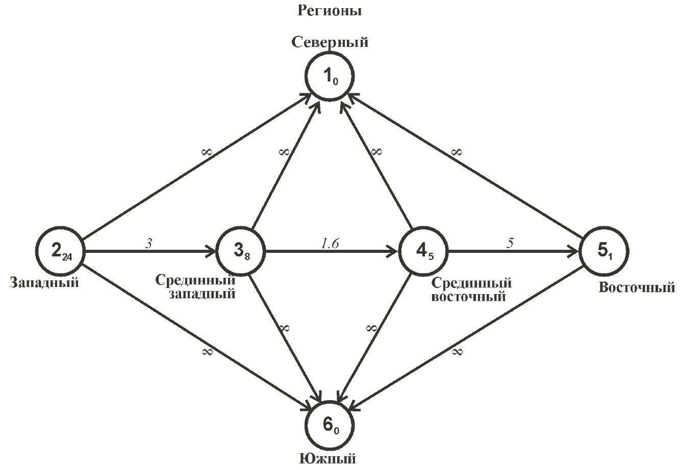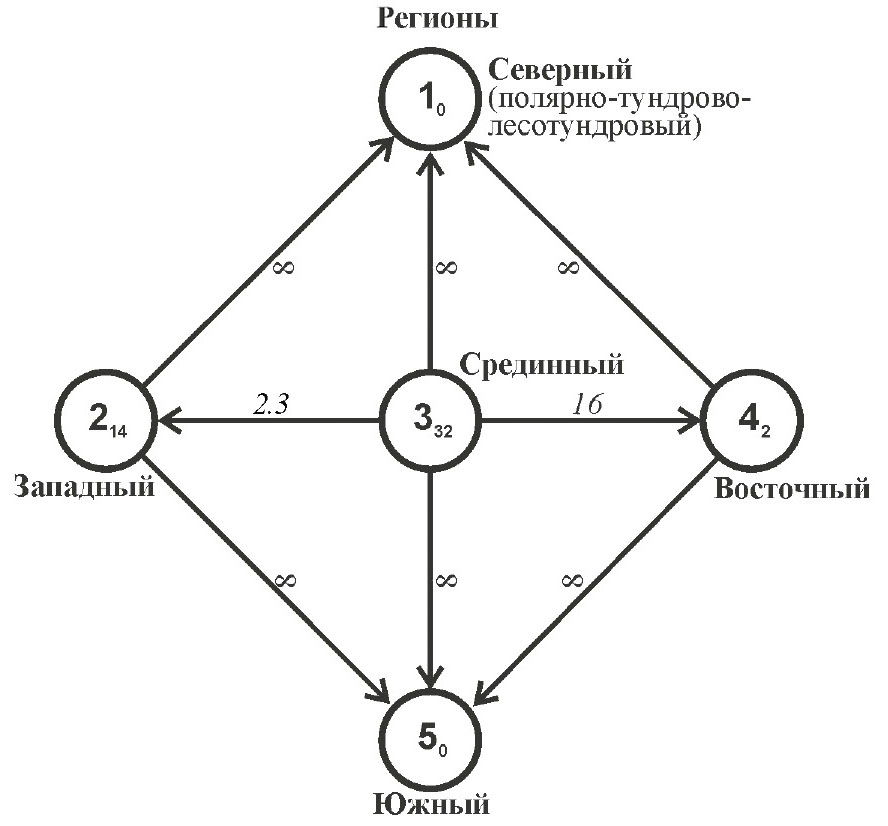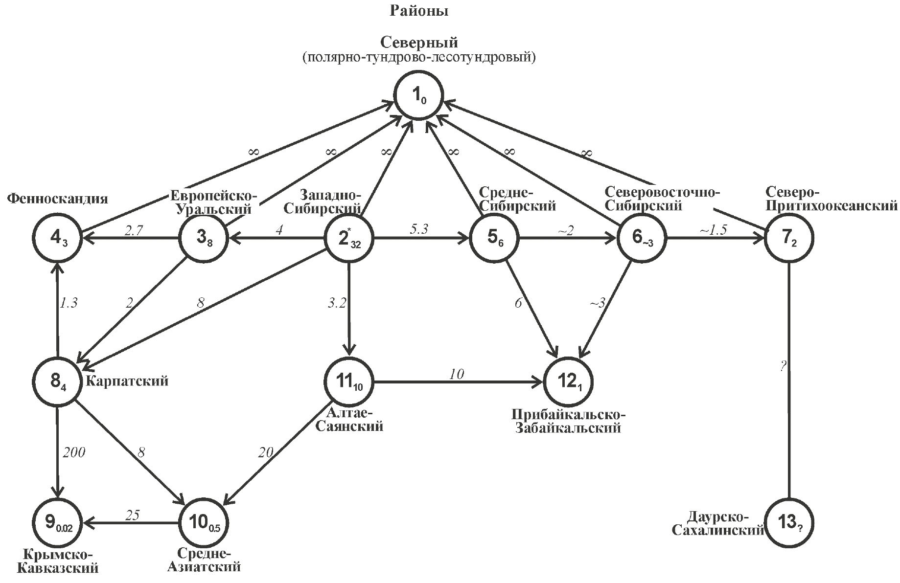 Граф, составленный по летнему распределению, можно обобщить по сходству обилия свиристеля. Тогда будет всего шесть таксонов классификации – регионов (рис. 2). Границы Северного и Южного, а также Западного региона и районов (Фенноскандии) остаются без изменений. Остальные объединены. При этом в Срединный западный регион вошли Восточно-Европейский, Западно- и Среднесибирский районы, а в Срединный восточный – Северовосточно-Сибирский и Северо-Притихоокеанский. Тенденция уменьшения обилия к востоку сохраняется (показано индексом у номера класса). На основе выполненной классификации и обобщенного графа можно провести районирование (деление на регионы) Северной Евразии по обилию свиристеля (рис. 3).
