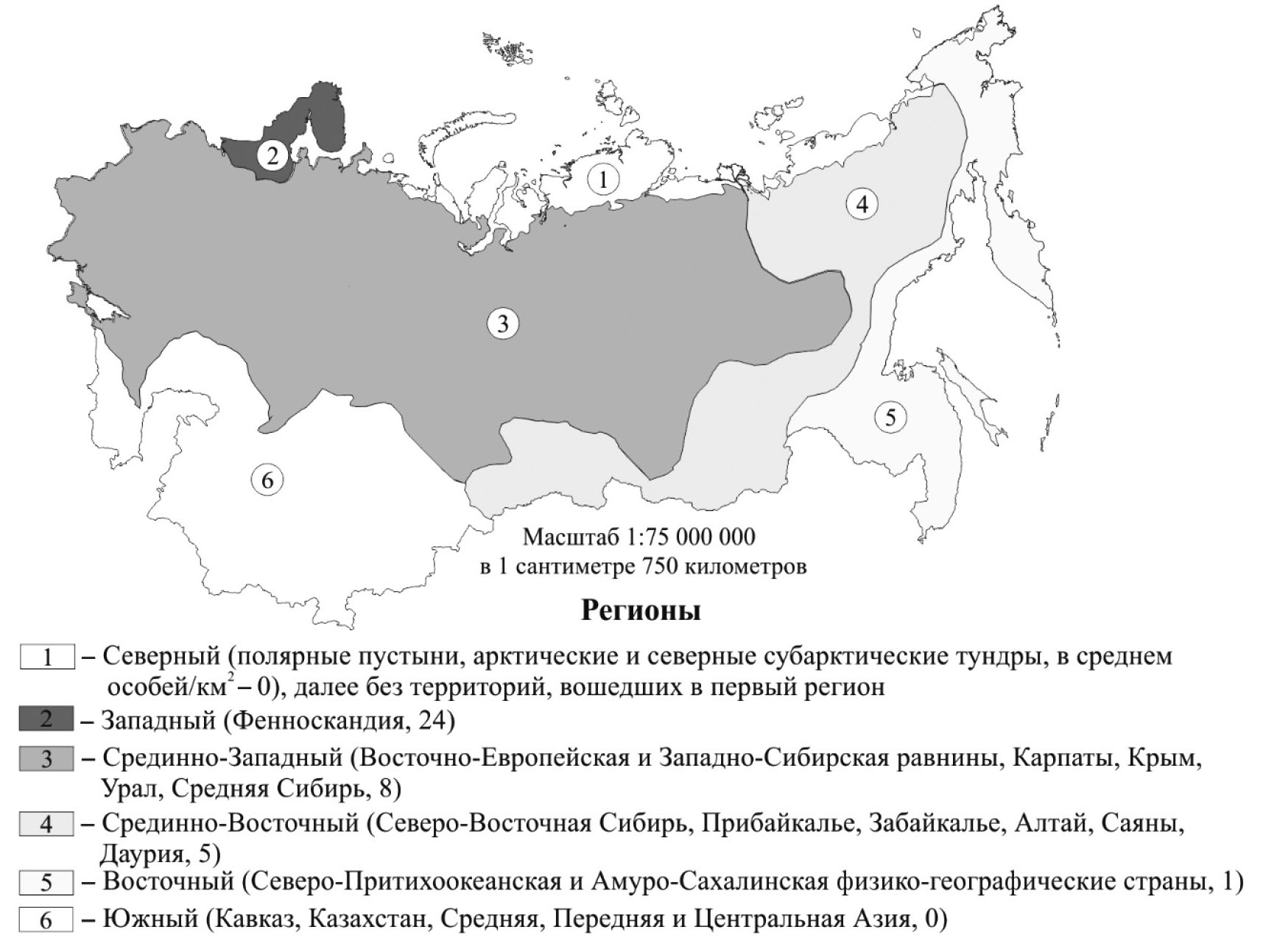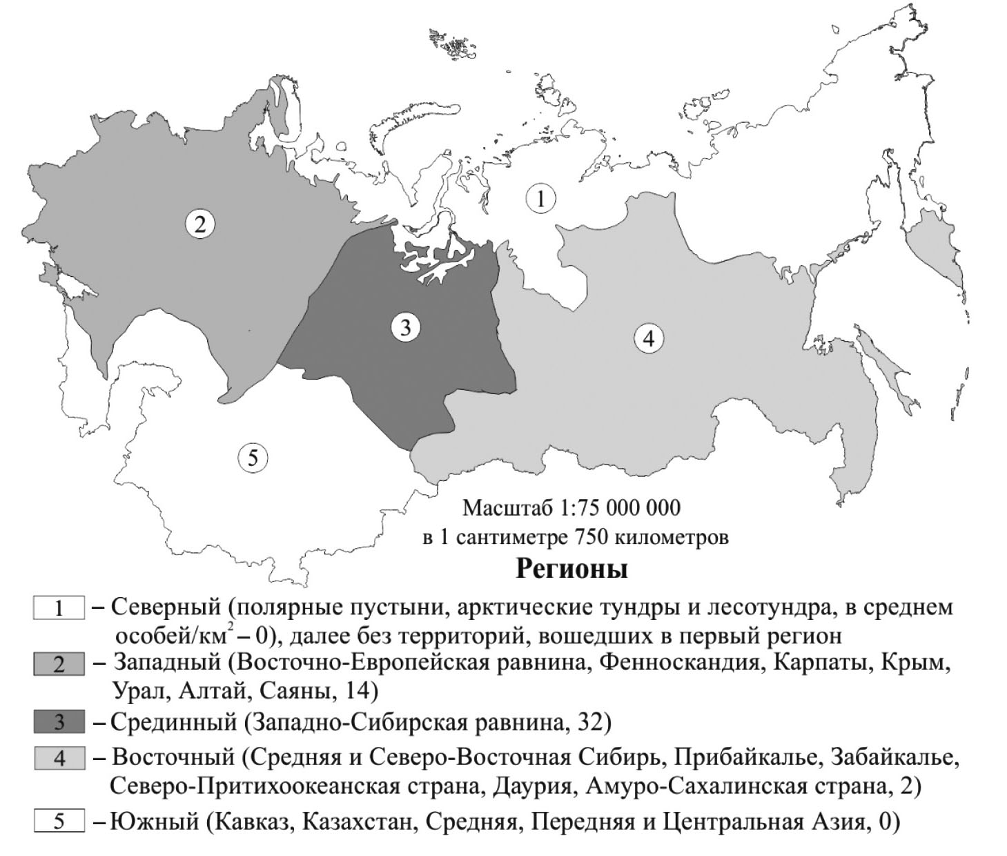 На основе классификации по зимнему обилию, распределению и распространению свиристеля возможно проведение районирования Северной Евразии. При этом целесообразно выделение пяти регионов (рис. 7). Среднее обилие по ним убывает от центра (Западно-Сибирская равнина) к западу и востоку в 2.3 и 16 раз и особенно сильно (до нуля) – к северу и югу от европейско-западносибирской части и к северу от юго-восточной.