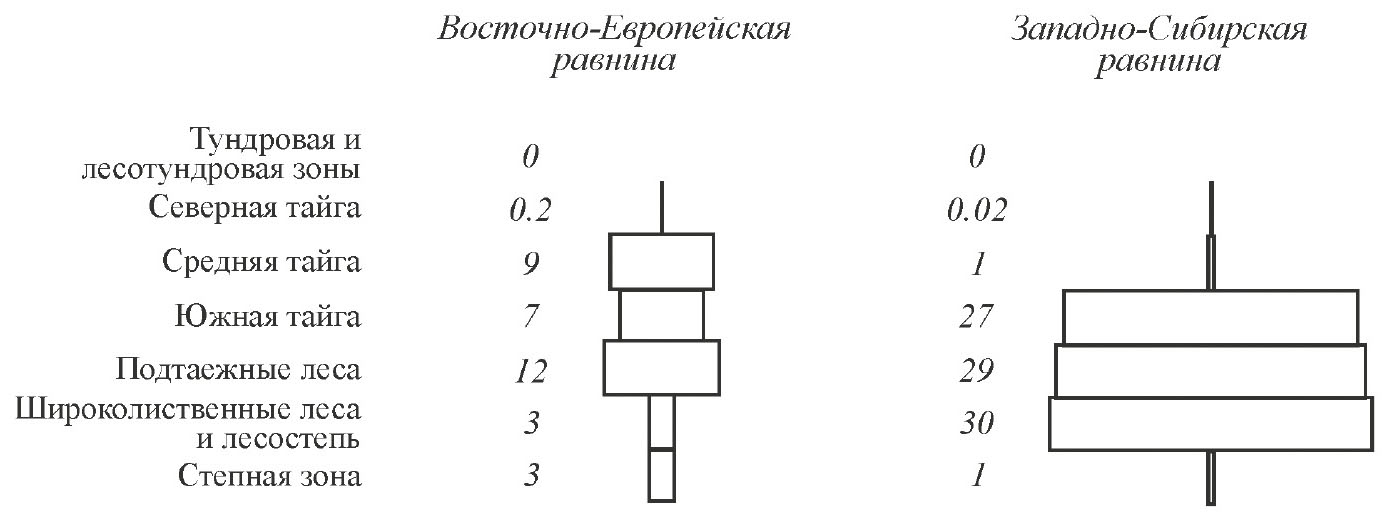 В зимний период (с ноября по март) в европейской части ареала свиристель в среднем многочислен в подтаежных лесах – 12 особей/км2 (рис. 4). В средней и южной тайге обычен (9 и 7 соответственно). Еще меньше его в широколиственных лесах, лесостепи и степной зоне, хотя в них он тоже обычен (по 3). Изредка встречали свиристеля в северной тайге и полупустынях (в среднем 0.2 и 0.8 соответственно). В полярных пустынях, тундрах и лесотундре свиристеля не было. На Западно-Сибирской равнине зимой его обилие выше всего в лесостепи, несколько меньше – в подтаежных лесах и южной тайге (30, 29 и 27 соответственно) и значительно меньше – в степной зоне, средней и северной тайге (1, 1 и 0.02 соответственно). Далее к северу он не встречен.