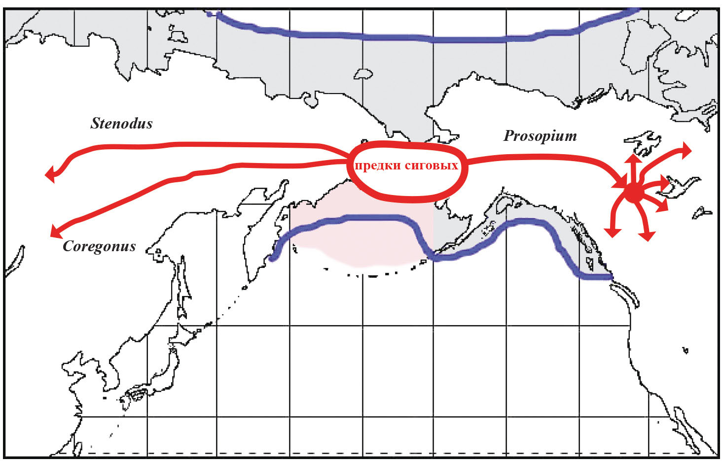 Казалось бы, поскольку именно в Северной Америке больше всего видов, в том числе и эндемичных видов, то именно здесь находятся центры возникновения и центры расселения подрода Leucichthys и рода Prosopium. Однако такое заключение справедливо только для рода Prosopium. Подрод Leucichthys действительно имеет больше всего видов в Северной Америке (13), здесь же и наибольшее число эндемиков (11), но все эндемики сравнительно молодые (некоторые американские систематики даже пытались объединить их в один вид), они ведут свое происхождение от первых вселенцев в Америку сибирской ряпушки. Наши представления о центре происхождения сиговых и путях их расселения показаны на рис. 3.