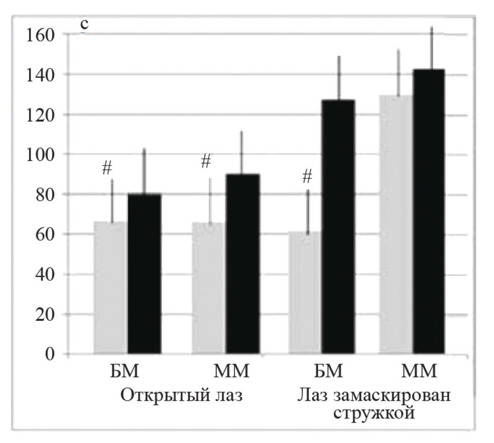 Мыши линий БМ и ММ, возраст 3 месяца (пятидневное введение ГК-2). Статистически значимых межгрупповых различий по ЛП перехода в темный отсек установки при открытом лазе не выявлено, однако тенденция к более короткому ЛП при введении ГК-2, по сравнению с контрольной группой, обнаружена (p = 0.08 для мышей линии ММ и p = 0.09 для мышей линии БМ) (рис. 2).