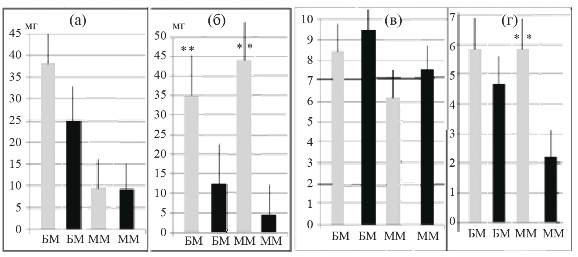 Рис. 5. Реакция на новую пищу в новой (не пугающей) обстановке у мышей БМ и ММ двух возрастных групп при действии пептида (серые столбики) и после введения физиологического раствора (черные столбики). Данные представлены в виде средних и стандартных ошибок среднего. (а) — количество съеденного сыра 3-месячными мышами за 5 мин. теста; (б) — количество съеденного сыра 8-месячными мышами за 5 мин. теста; (в) — число подходов 3-месячных мышей к кормушке с новой пищей; (г) — число подходов 8-месячных мышей к кормушке с новой пищей; ** — статистически значимое отличие (p < 0.01) от показателей соответствующей контрольной группы (двухфакторный ANOVA, post hoc LSD-тест по Фишеру).