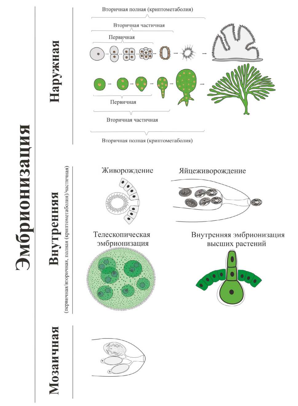 Независимое появление эмбриональной стадии в онтогенезе разных, филогенетически и экологически далеких друг от друга групп водорослей, а также у предков животных отчетливо свидетельствует о том, что эмбрионизация исходно не была адаптацией к неким условиям жизни, но представляла собой всего лишь один из трех возможных способов построения многоклеточного тела. Такую эмбрионизацию имеет смысл обозначить, как первичную, противопоставляя ее вторичной эмбрионизации, возникающей на более поздних этапах эволюции многоклеточных и связанную со смещением некогда свободноживущих стадий онтогенеза под эмбриональные оболочки (рис. 1). Обратный процесс, дезэмбрионизация, ни в каких известных случаях не приводит к полному отказу от эмбрионального способа развития и возврату к архаичным протонемному или сифоносептальному способам формирования многоклеточного тела. Рассмотрим теперь пути эволюции эмбриональной стадии развития в онтогенезе высших растений и животных.