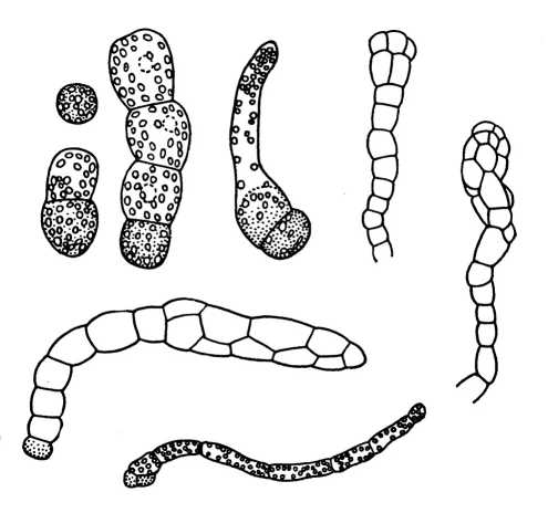 Рис. 2. Протонемный способ формирования многоклеточного тела у гаметофитов разных видов печеночных мхов (по: Абрамов, Абрамова, 1978, с изменениями).