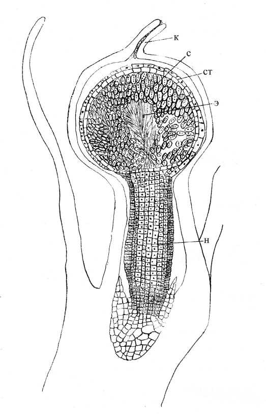 Рис. 3. Криптометаболия спорофита у печеночника Pellia epiphylla (Linnaeus, 1753). к — колпачок калиптры, н — ножка спорангия, c — споры, ст — стенка спорангия, э — элатеры (по: Мейер, 1982, с изменениями).
