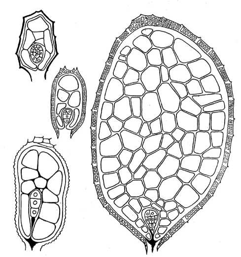 Рис. 6. Строение зрелых семян с дезэмбрионизированными зародышами, окруженными крупными клетками эндосперма, у некоторых паразитных растений из семейств Gentianaceae и Triuridaceae (по: Терехин, 1977, с изменениями).