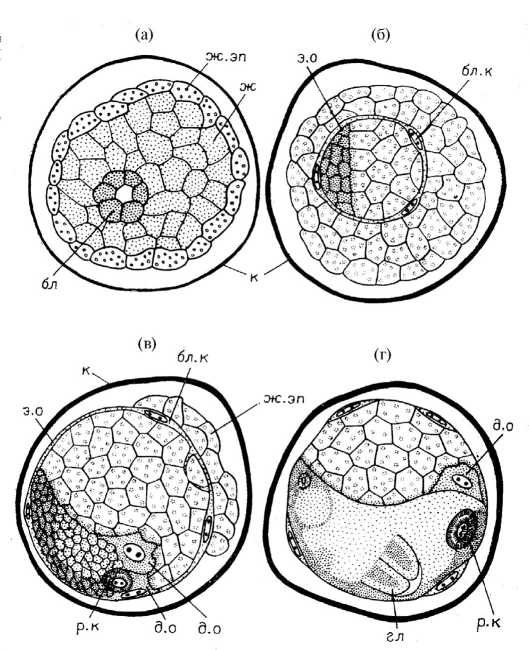 Рис. 10. Развитие зародыша Monocelis fusca Örsted, 1843 внутри яйцевой капсулы (а–г) — последовательные стадии развития). бл — бластула, бл.к — бластопоральная клетка, гл — глотка, д.о — дополнительная клетка оболочки, ж — желточная клетка, ж. эп — желточный эпителий, к — капсула, р.к — ресничная клетка, э.о — эмбриональная оболочка (по: Иванова-Казас, 1975; Giesa, 1966).