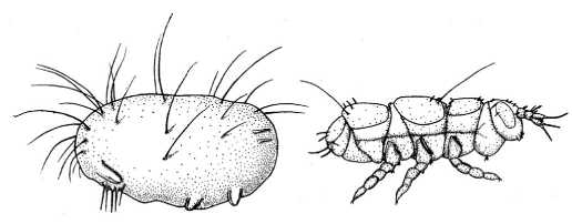 Рис. 14. Первая неподвижная личиночная стадия двухвостки Evalljapyx facetus Smith, 1959 (слева) и группа таких же стадий Parajapyx isabellae (Grassi, 1886) в подземном укрытии (справа) (по: Smith, 1961).
