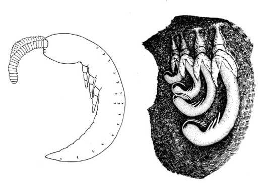 Рис. 13. “Пупоидная” стадия (слева) и первая подвижная личинка (справа) в онтогенезе многоножки Pauropus silvaticus Tiegs, 1943 (по: Tiegs, 1947).