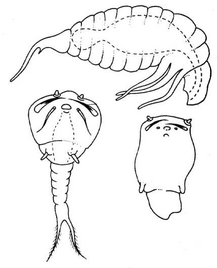 14. Fig. 13. The “pupoid” stage (left) and the first mobile larva (right) in the ontogenesis of the millipede Pauropus silvaticus Tiegs, 1943 (after Tiegs, 1947).