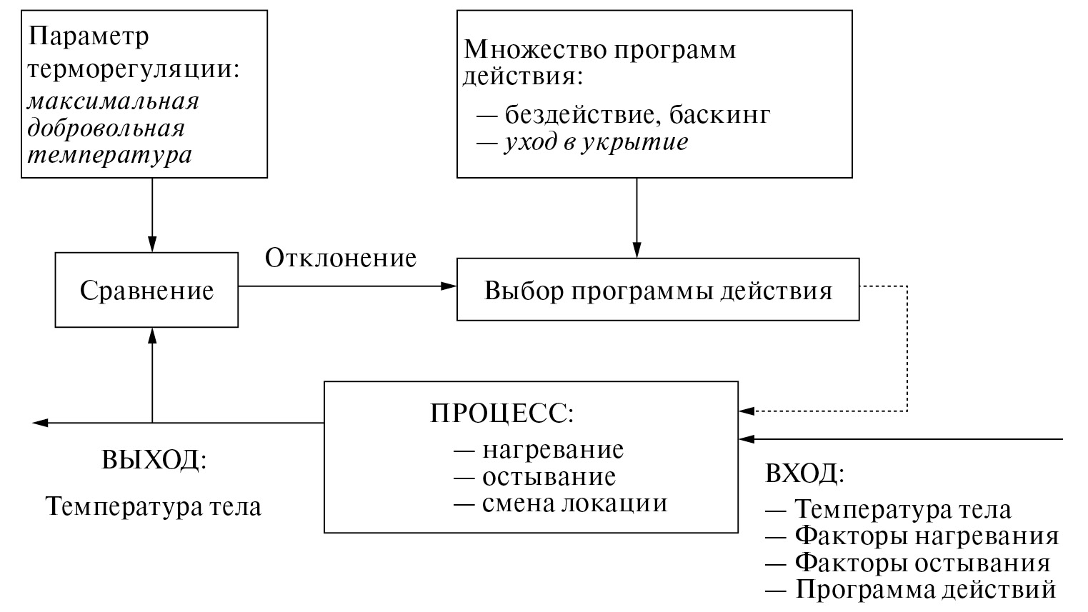 Например, реакция избегания перегрева в терминах обратной связи будет описана следующим образом (рис. 1): при нагревании текущая температура тела особи возрастает (на выходе), и, если сравнение с критерием (штатной температурой) выявляет отклонение (превышение), это побуждает животное к перемене места (программа по изменению локации); если в новом укрытии (на входе) тепловые потоки сокращаются, это ведет за собой снижение температуры тела (на выходе); увеличение значений на выходе влечет за собой действия, уменьшающие значения на входе и, как следствие, уменьшение значений на выходе. Есть основания полагать, что три известных “принципа регулирования” (Агаджанян и др., 2003, с. 35) реализуются в процессе терморегуляции рептилий в разных ситуациях.