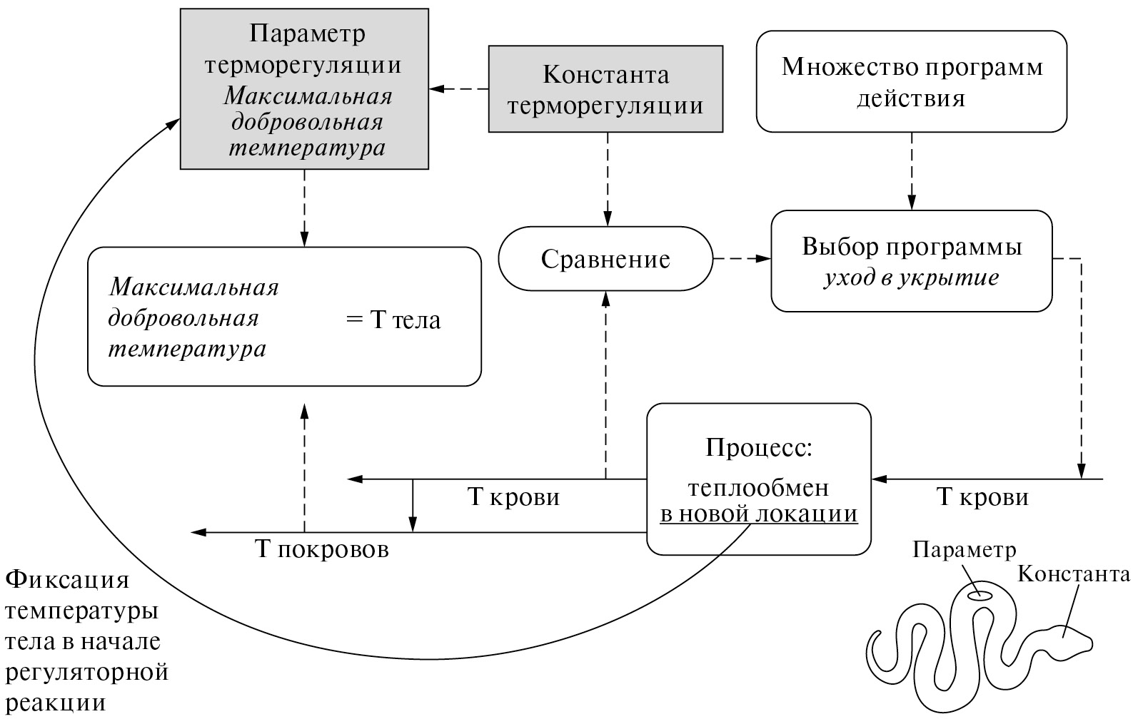 Терморегуляция — направленное изменение особью температуры своего тела, “активный выбор определенных температур” (Коросов, 2015, с. 78). В физиологической литературе бытуют другие определения терморегуляции: “функция поддержания постоянной температуры тела” (Иванов, 1985, с. 36), “поддержание оптимальной... температуры тела” (Терморегуляция, 2016, с. 77) или “поддержание температуры тела в ограниченном диапазоне” (Glossary…, 2003, p. 97). Эти последние дефиниции в контексте нашего сообщения неприемлемы. Во-первых, они явно отрицают наличие терморегуляции у пойкилотермных рептилий. Во-вторых, не соответствуют техническому определению регуляции, приведенному выше, а являются синонимами понятию температурный гомеостаз. Термин температурный гомеостаз призван отразить феномен температурной устойчивости характеристик животного в меняющейся среде, тогда как термин регуляция относится к механизму поддержания этого постоянства, к отдельному акту активности животного, к феномену сиюминутного изменения температуры тела за счет активности самого животного. Именно этот методологический принцип позволяет перейти к строгому количественному описанию регуляции посредством отрицательной обратной связи.