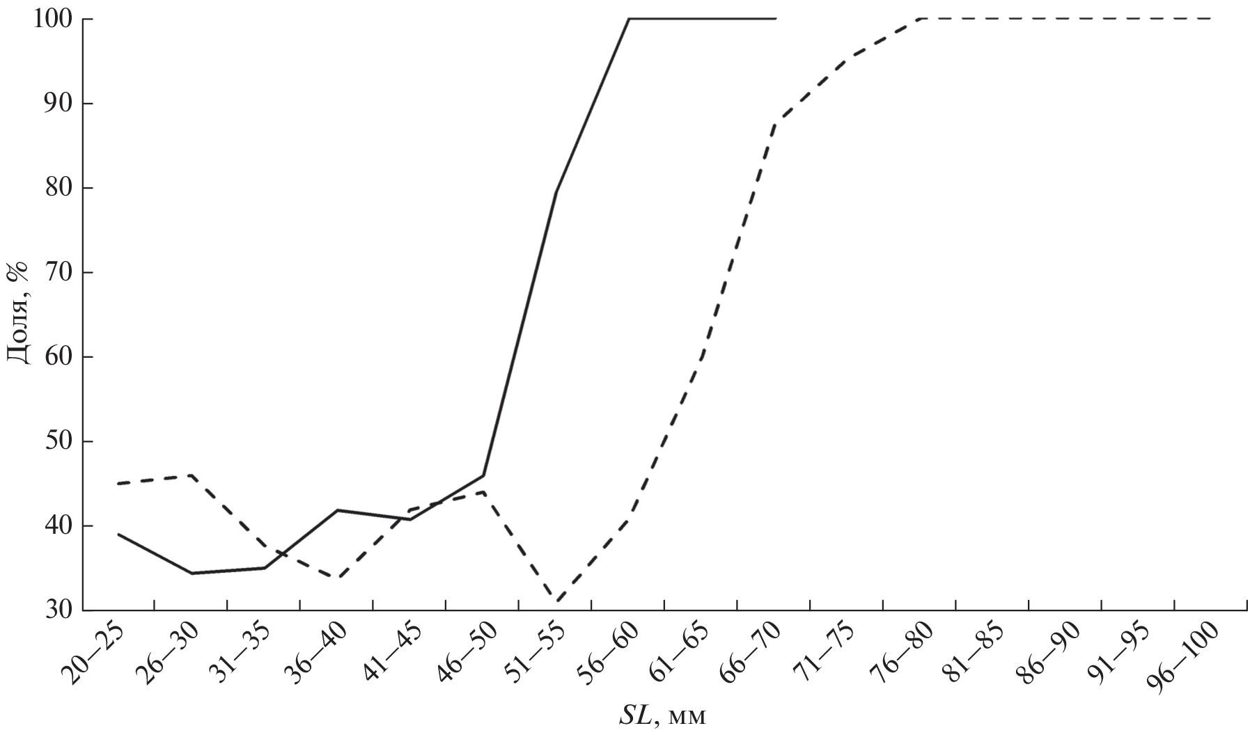 Size-age and sex population structure have been studied for the aboriginal stellate tadpole-goby Benthophilus stellatus and Don tadpole-goby B. durrelli in the Don River basin. The females of Don tadpole-goby mature at a body length of about 35 mm, stellate tadpole-goby females, at 50 mm. Most breeders of Don tadpole-goby (~74%) are characterized by one-time spawning, stellate tadpole-goby spawns three times. The duration of the breeding season is about 3.5 and 1.5 months, the individual absolute female fecundity is 0.2–0.6 and 1–3 thousand eggs, respectively. All breeders of Don tadpole-goby die after spawning in the second year of life, an insignificant part of stellate tadpole-goby population lives up to three years. The food spectra, size and biotopic variability, the degree of food similarity, and the selectivity of food organisms in both species have been analyzed. The species are characterized by the similarity in feeding and high feeding flexibility. In the Tsimlyansk Reservoir, the main food objects for tadpole-gobies are mosquito larvae and the mollusk Lithoglyphus naticoides, in the lower reaches of the Don River, various crustaceans. We assume three species of tadpole-goby (Don, stellate tadpole-goby and Makhmudbekov tadpole-goby B. mahmudbejovi) inhabit currently in the Volga River reservoirs. Don tadpole-goby has also settled in the lower reaches of the Volga River. Apparently, its range includes the Black Sea, in addition to the native Sea of Azov and newly mastered Volga River basins.