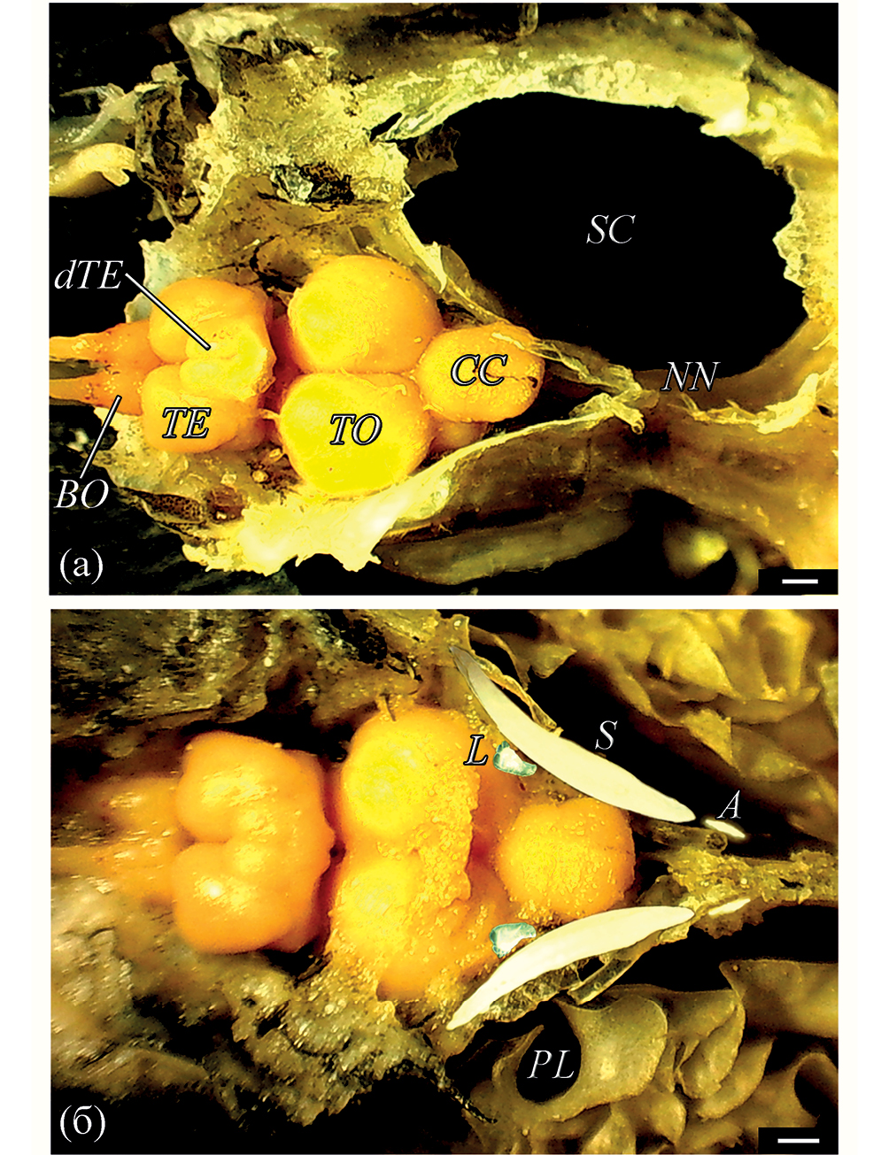 Рис. 1. Мозг анабаса Anabas testudineus, вид сверху: а – общий вид, наджаберный орган удалён, самка TL 127 мм; б – предполагаемое взаимное расположение отолитов (в разных горизонтальных плоскостях), самец TL 118 мм. A – астерискус, BO – обонятельная луковица, dTE – дорсальный выступ переднего мозга, CC – мозжечок, L – лапиллус, NN – узкая задняя часть нейрокраниума, PL – пластинки лабиринта, S – сагитта, SC – наджаберная камера, TE – передний мозг, TO – оптический тектум. Масштаб: 1 мм.