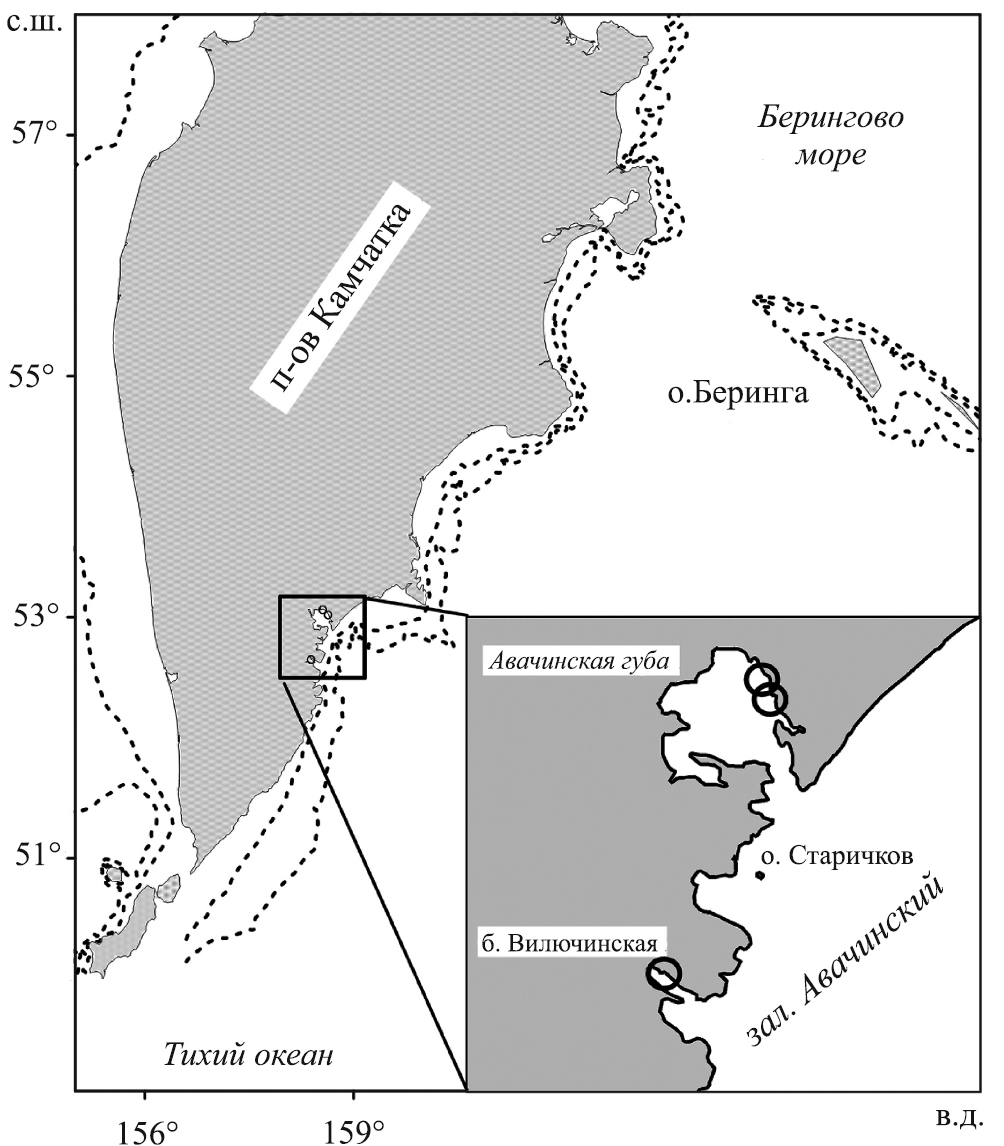 Пять личинок рыбы-лягушки абсолютной длиной (TL) 6.3, 6.4, 7.2, 7.3 и 8.0 мм поймал А.М. Токранов в северо-восточной части Авачинской губы вблизи сопки Никольская 22.08.2021 в двух приливных лужах во время отлива. Длина тела до конца хорды (NL) составила соответственно 5.9, 6.0, 6.6, 7.0 и 7.2 мм. Три личинки рыбы-лягушки TL 5.9, 6.4 и 6.8 мм (NL соответственно 5.5, 6.0 и 6.4 мм) собраны Н.П. Санамян (КФ ТИГ ДВО РАН) в б. Вилючинская на тихоокеанском побережье Камчатки (Авачинский залив) 16.06.2022. Они были обнаружены на ризоидах ламинарии, растущей на каменисто-песчаном грунте на глубине 5 м. Места поимки личинок показаны на рис. 1. Пойманных личинок фиксировали 70%-ным этанолом.