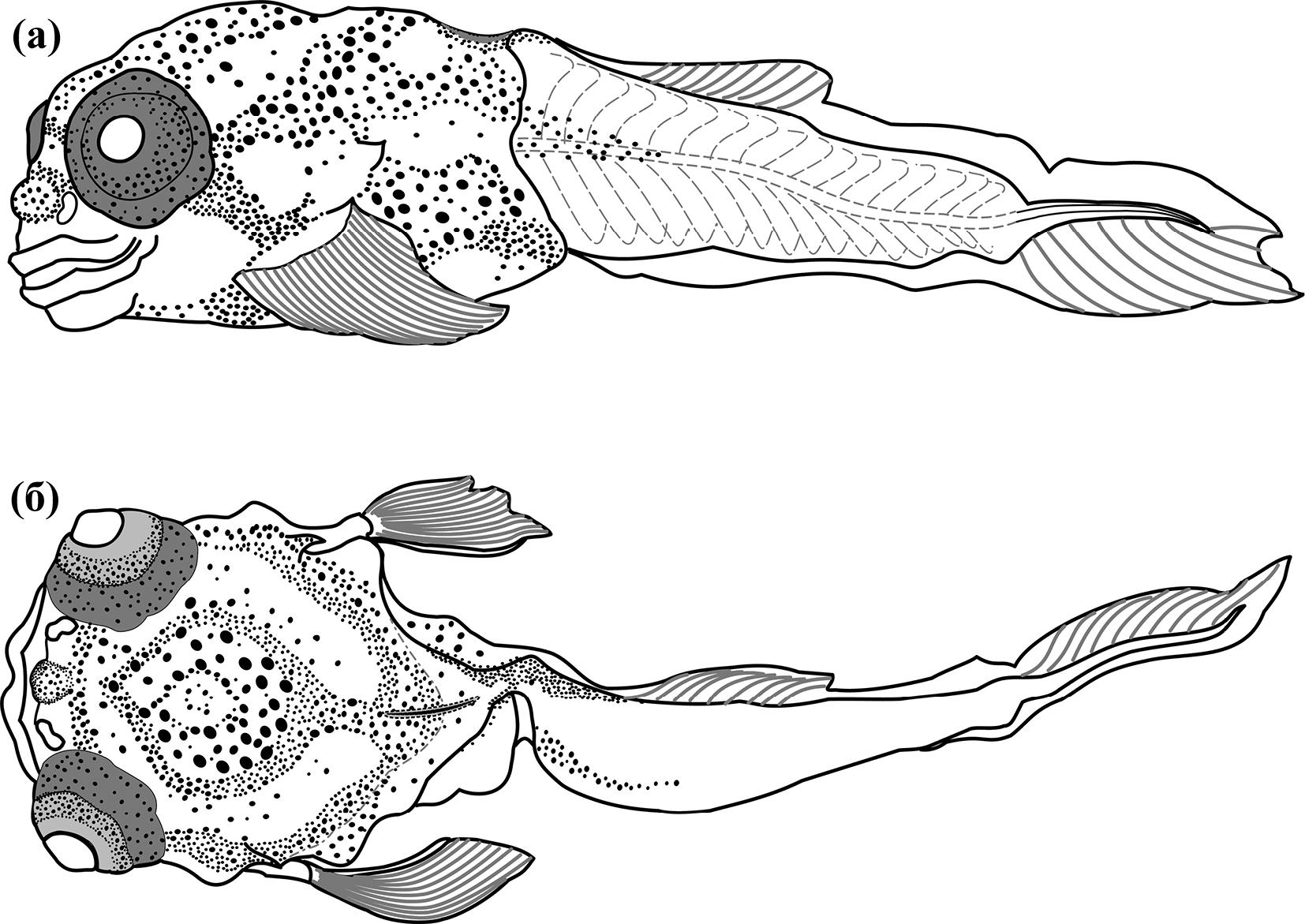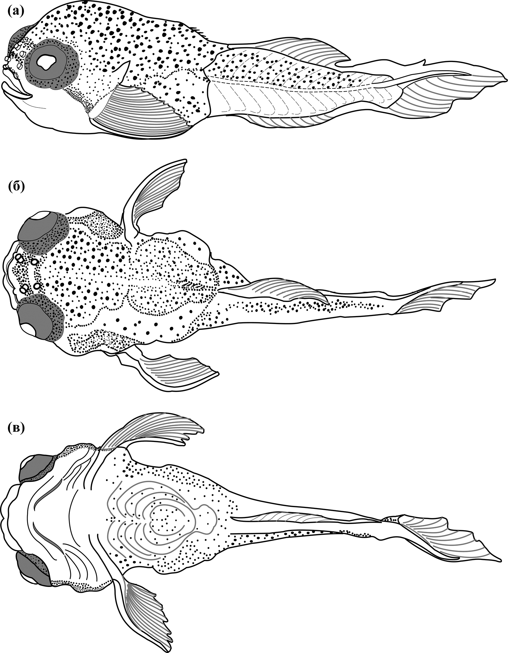 Две личинки NL 6.0 мм. Длина туловища 2.5–3.0 мм, толщина 1.7 мм при виде сверху. Личинки лучше сформированы, чем предыдущие, головастикообразная форма тела сохраняется. Присасывательный диск хорошо развит. Плавниковая кайма довольно широкая, разной ширины (средняя часть узкая), но немного меньше, по сравнению с предыдущей личинкой. Зачатки лучей второго спинного и анального плавников стали выделяться из плавниковой каймы. Самый верх спины в районе основания первого спинного плавника более выпуклый. Хорошо видна ложбинка в задней части медиодорсальной линии на спине в месте формирования первого спинного плавника. У одной личинки первый спинной плавник не заметен, полностью скрыт под кожей. У другой в желобке на месте основания первого спинного плавника появляются еле заметные зачатки колючих лучей (рис. 2). Зачатки мягких лучей остальных плавников хорошо заметны. Грудные плавники веерообразной формы, широко прикреплены по бокам туловища – по линии пигмента. Уростиль длинный, задняя часть его образует заметный изгиб кверху. Глаза выпуклые, интенсивно пигментированы, на две трети погружены под кожу. Верхняя губа хорошо выражена при виде сверху. Сенсорных бугорков нет. На их месте небольшие валики на уровне нижнего края глаза. Заметны очень маленькие парные бугорки над верхней губой и между глаз. Жаберная крышка почти полностью оформилась, но жаберные лучи не сформированы. Жаберные отверстия уменьшились. Заметны маленькие уголочки в верхней части жаберных крышек.