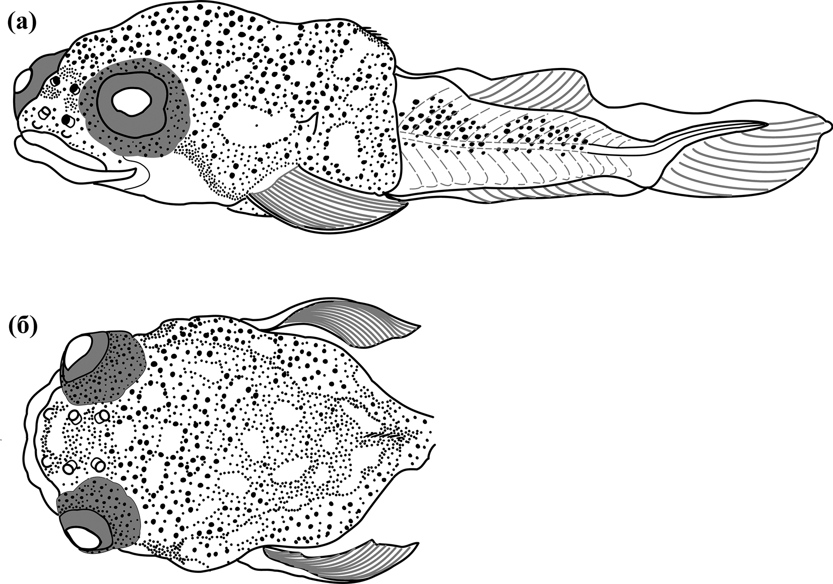 Рис. 2. Личинка рыбы-лягушки Aptocyclus ventricosus NL 6.0 мм из Авачинской губы, вид: а – сбоку, б – сверху. Здесь и на рис. 3–5: NL – длина тела до конца хорды.