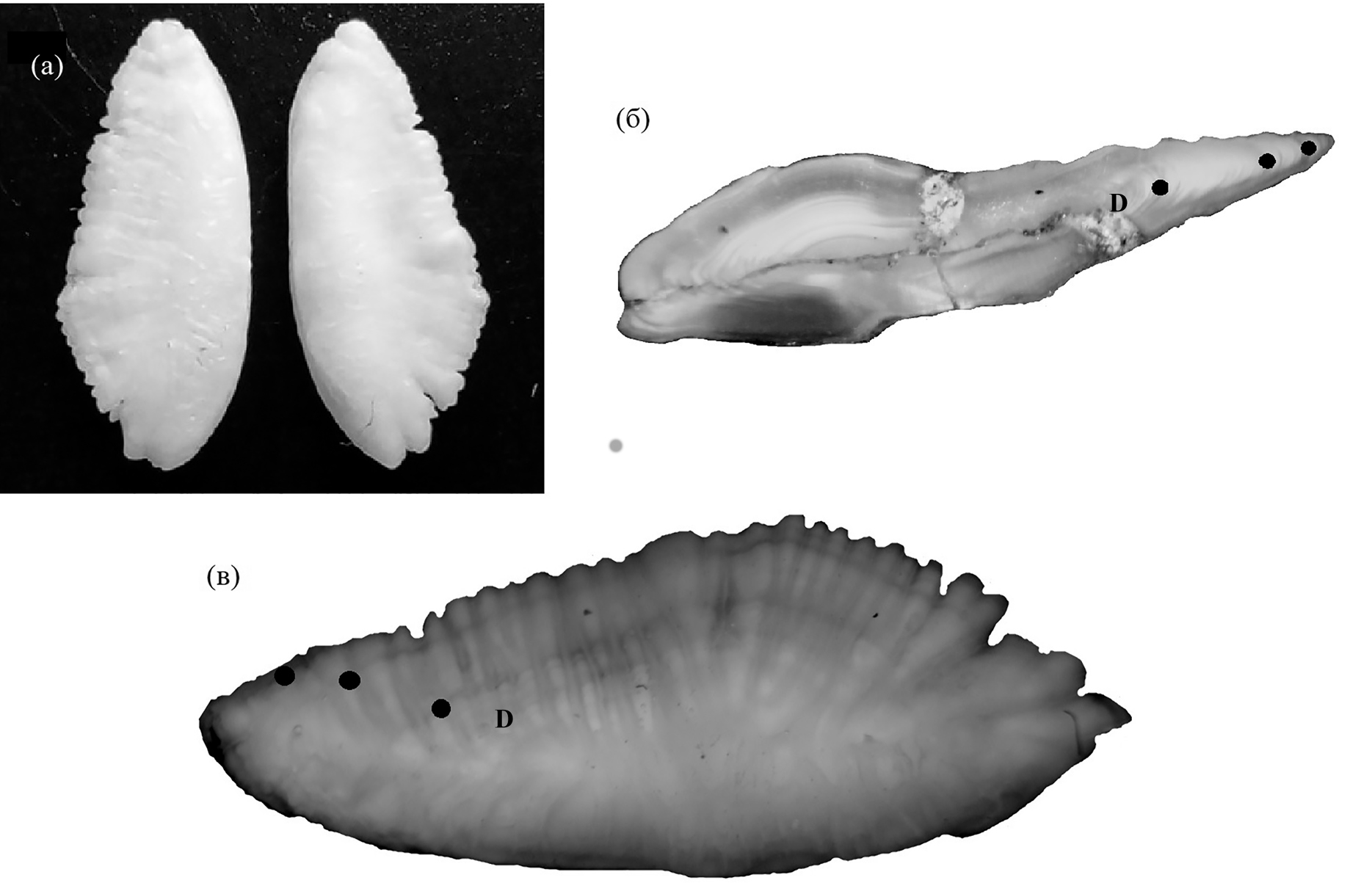 Рис. 2. Сагитты европейской мерлузы Merlucius merluccius TL 30.6 см, выловленной у берегов Юго-Западного Крыма: а – внешний вид, б – фронтальный срез через центр, в – целый отолит; кольца: (●) – годовые, D – демерсальное.
