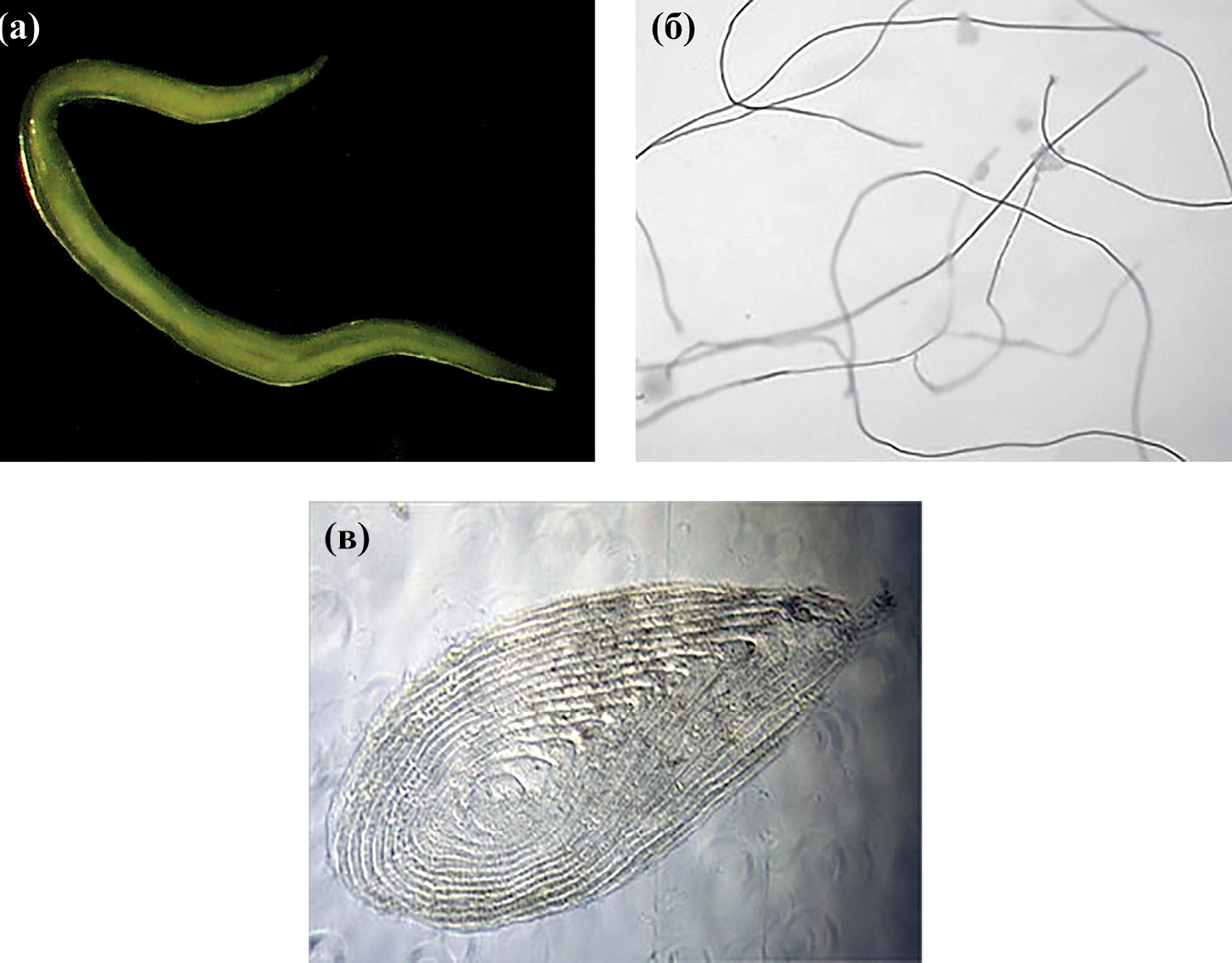 Рис. 4. Нематода (а), нити (б) и чешуя (в) из желудочно-кишечного тракта особи европейской мерлузы Merluccius merluccius TL 30.6 см, выловленной у берегов Крыма.