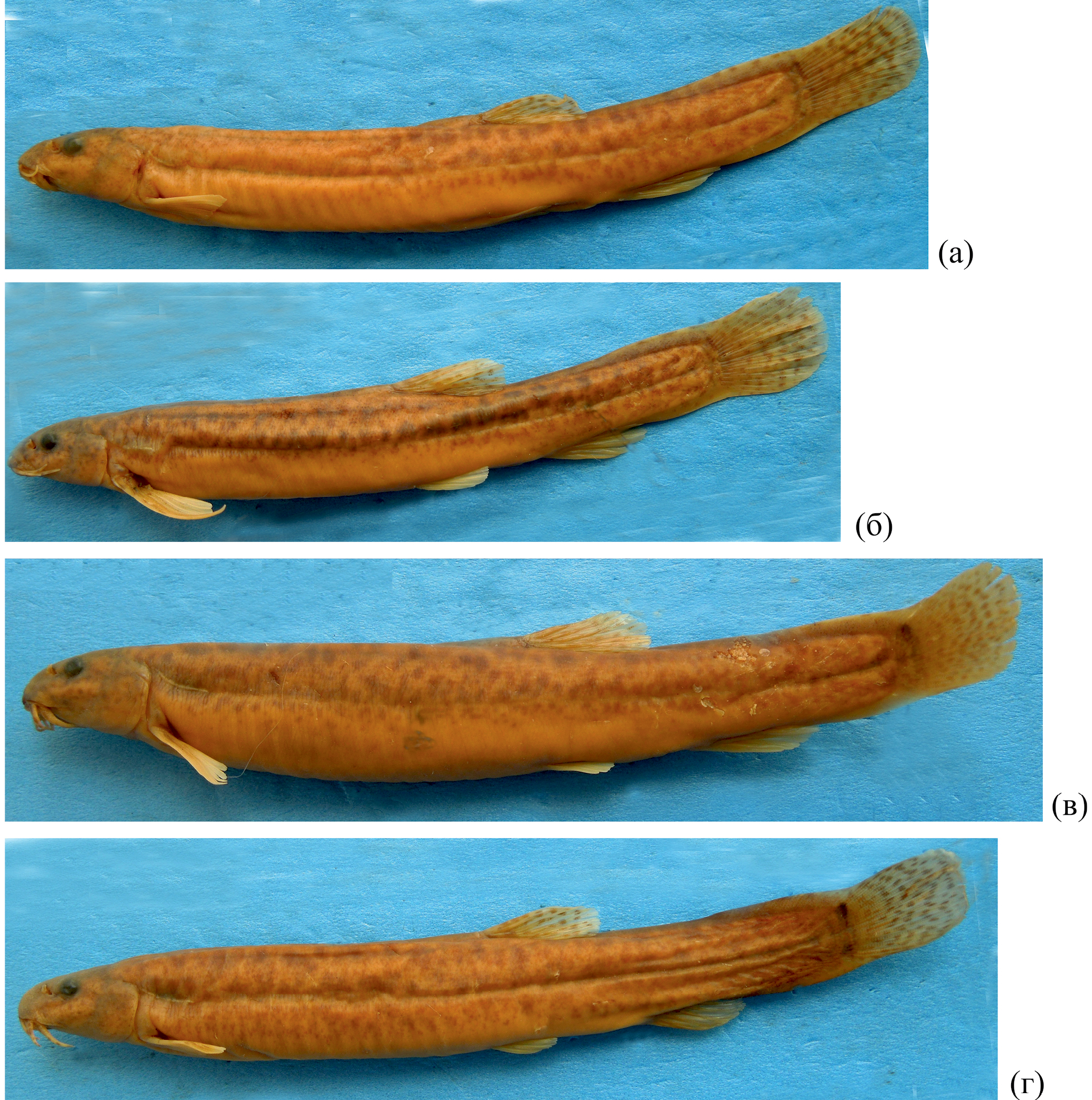 Рис. 4. Misgurnus anguillicaudatus из Каракумского канала, пгт. Карамет-Нияз, Туркмения, ЗММУ Р-10435: а – самка SL 91.5 мм (начало спинного плавника ближе к концу хвостового плавника, чем к концу рыла), б – самец SL 77.0 мм, в – самка SL 94.0 мм, г – самка SL 93.0 мм.