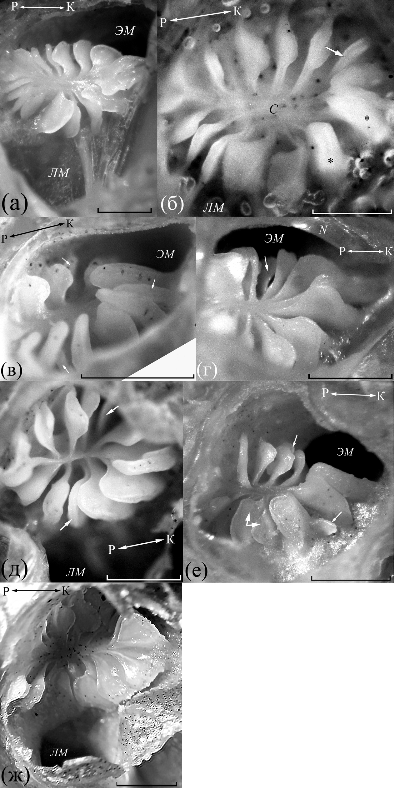 Рис. 6. Нетипичные складки в обонятельной розетке Amphiprion polymnus: а, б – горизонтально дихотомические складки с соответственно узко и широко расходящимися лопастями; в – вертикально дихотомическая складка, г–е – интеркалярная складка (→) на разных стадиях формирования.