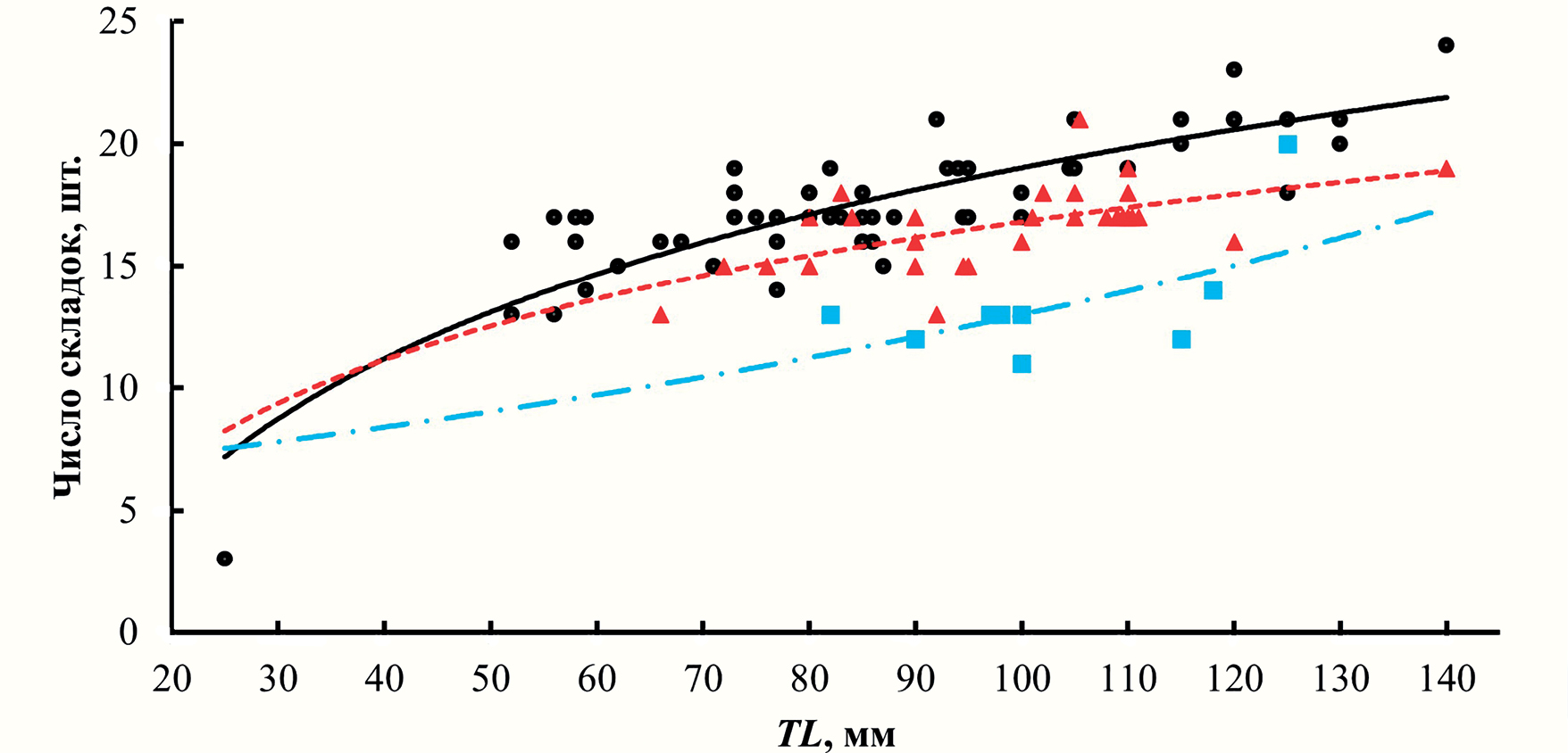 Примечание. Nf – число складок, шт.; *указано число рыб, у которых обнаружены соответствующие складки; над чертой – пределы варьирования показателя, под чертой – среднее значение.