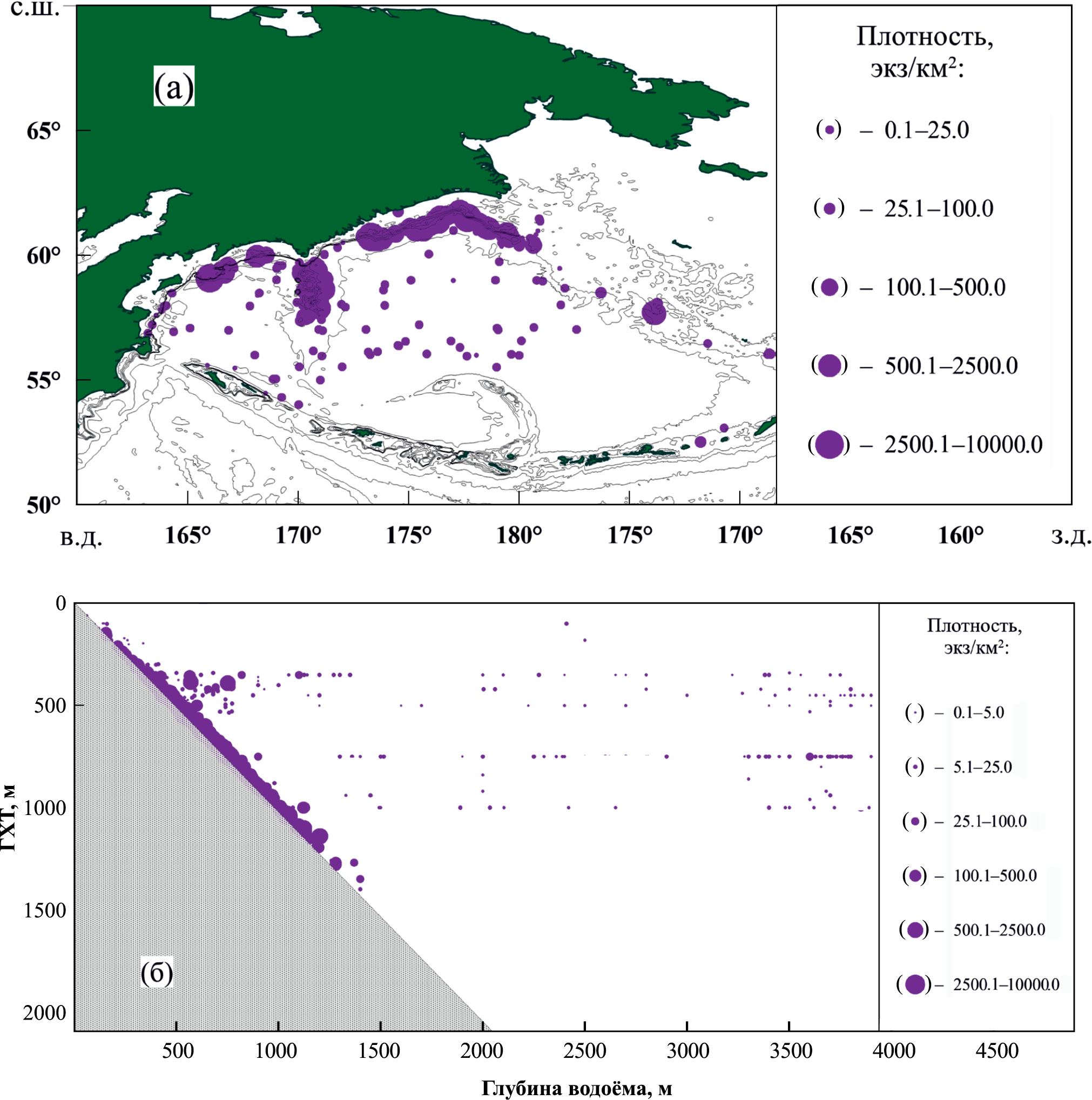 Распределение разновозрастных групп малоглазого макруруса. Малоглазый макрурус распространён в Беринговом море от Командорских и Алеутских о-вов на юге до м. Наварин на севере. Максимальные скопления этого вида обнаружены на свалах глубин Командорской и Алеутской котловин, а также на разделяющем их хребте Ширшова (рис. 3а). Макрурус встречается на глубинах от 99 м до максимальной из исследованных нами (1200 м), а наиболее плотные скопления, медианные значения которых варьируют от 1800 до 2200 экз/км2,образует на материковом склоне на глубинах 500–1200 м. В меньших количествах, не образуя скоплений, макрурус встречается в мезобатипелагиали в горизонте от 140 до 1000 м вышеуказанных котловин над глубинами 500–4000 м (рис. 3б).