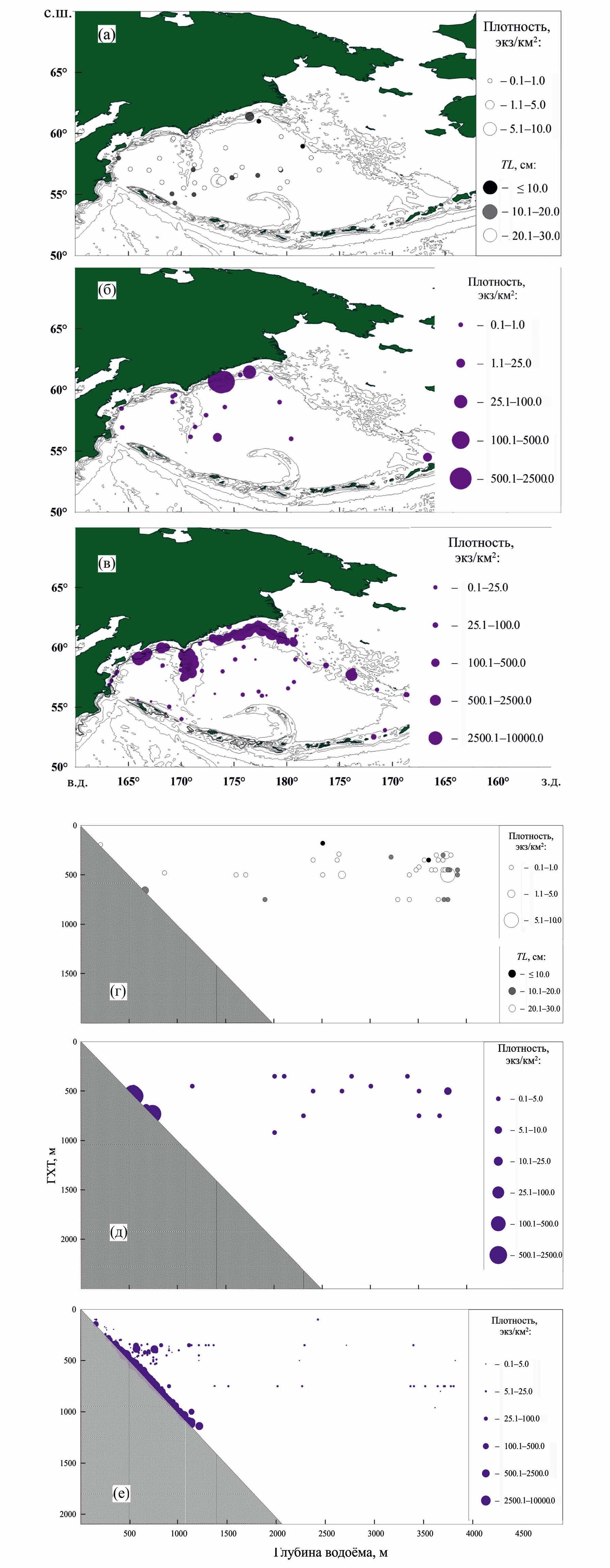 Личинки TL ≤ 10.0 см единично отмечены в центральной и северо-западной частях Берингова моря (рис. 4) – в батипелагиали на глубинах 160–300 м (рис. 4г). Низкая частота их встречаемости обусловлена низким коэффициентом уловистости таких объектов и, вероятно, тотальным разрушением мягких тканей молоди в тралах.