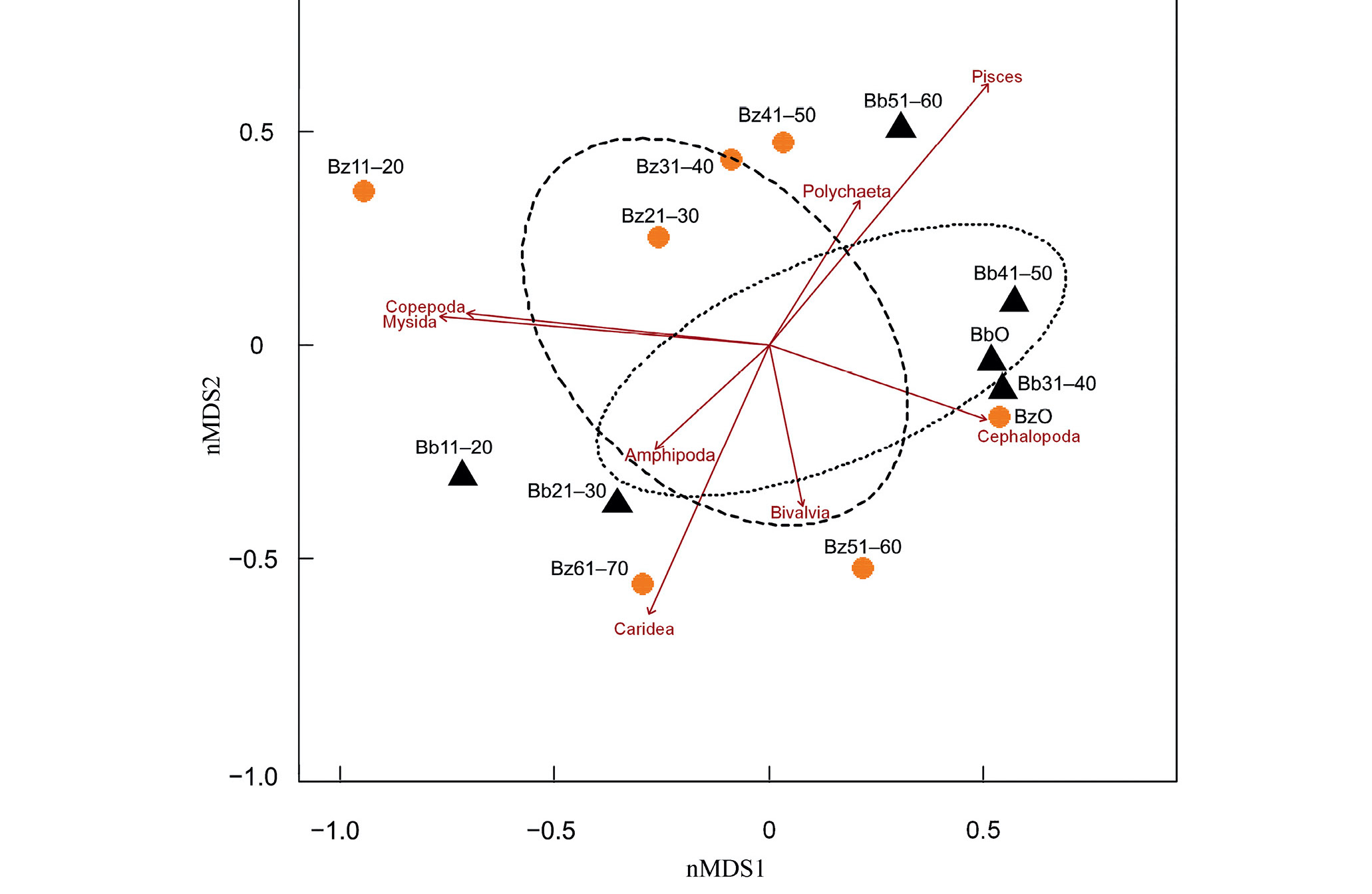 Рис. 1. Ординационная диаграмма спектров питания Bothrocara zestum (Bz, ---, ●) и B. brunneum (Bb, ···, ▲) в Охотском море по размерным группам, полученная методом nMDS-анализа. После аббревиатур названия вида указаны диапазоны размеров рыб (общая длина, см). BzO, BbO – обобщённые средние значения по соответствующим видам.