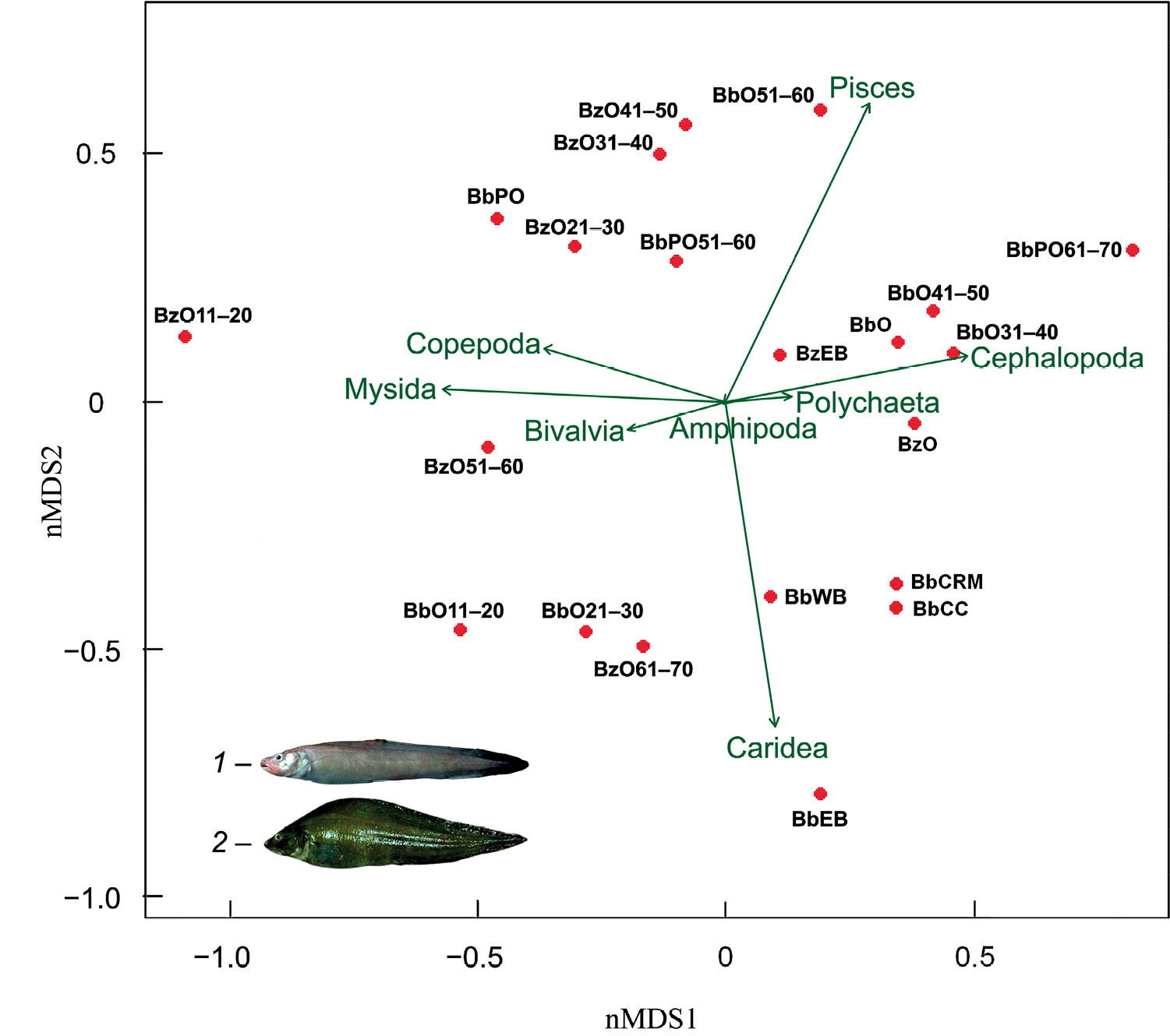Рис. 2. Ординационная диаграмма спектров питания Bothrocara zestum (Bz, 1) и B. brunneum (Bb, 2) в разных районах северо-западной части Тихого океана, полученная методом nMDS-анализа. Стрелками с подписями обозначены векторы долей пищевых компонентов по основным таксонам жертв. После аббревиатур названия вида указаны регион и диапазоны размеров рыб (общая длина, см). Регион: О – Охотское море, PO – Тихий океан; WB, EB – западная и восточная части Берингова моря; CC – воды у Северной Калифорнии, CRM – устье р. Колумбия.