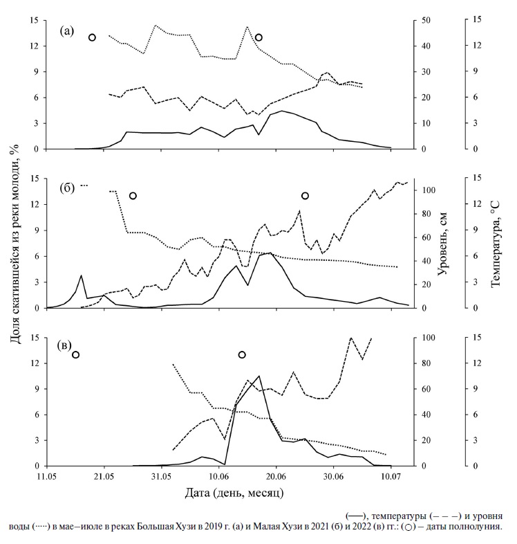 В начальный период покатной миграции наблюдалась положительная корреляция интенсивности ската с температурой воды и отрицательная с её уровнем, в завершающий период, напротив, отрицательная с температурой воды и положительная с её уровнем. При массовой миграции значения коэффициента корреляции ската с температурой и уровнем воды были ниже. Связь интенсивности ската, оценённая по отклонениям каждого из измеряемых признаков на фазе подъёма численности покатников, с температурой воды оказалась слабее рассчитанной по их фактическим значениям для начального периода миграции, а с уровнем воды практически отсутствовала (табл. 3). Наиболее рано массовый скат начался в 2019 г., он совпал с тёплой весной в этом году, в котором средняя температура воздуха в мае составила 3.9°С против 2.0 и 2.6°С соответственно в 2021 и 2022 гг.